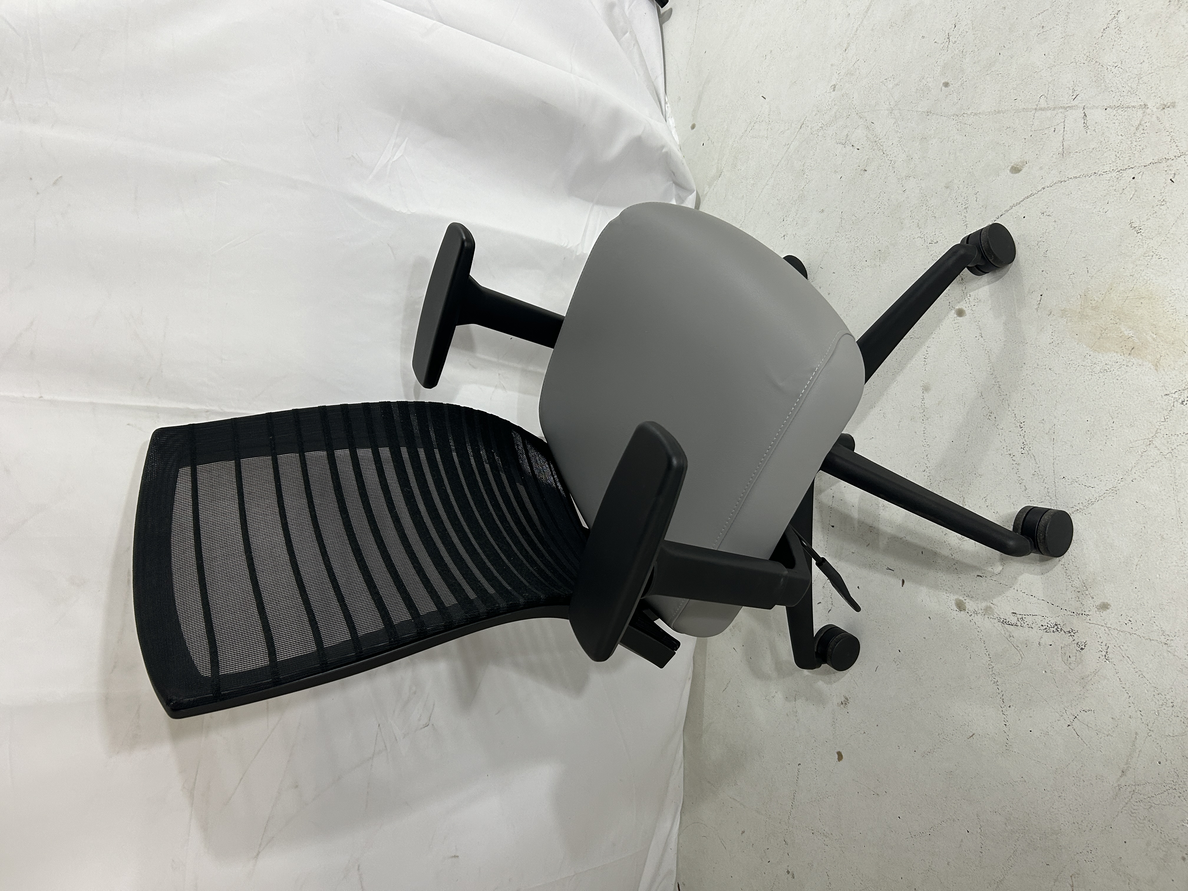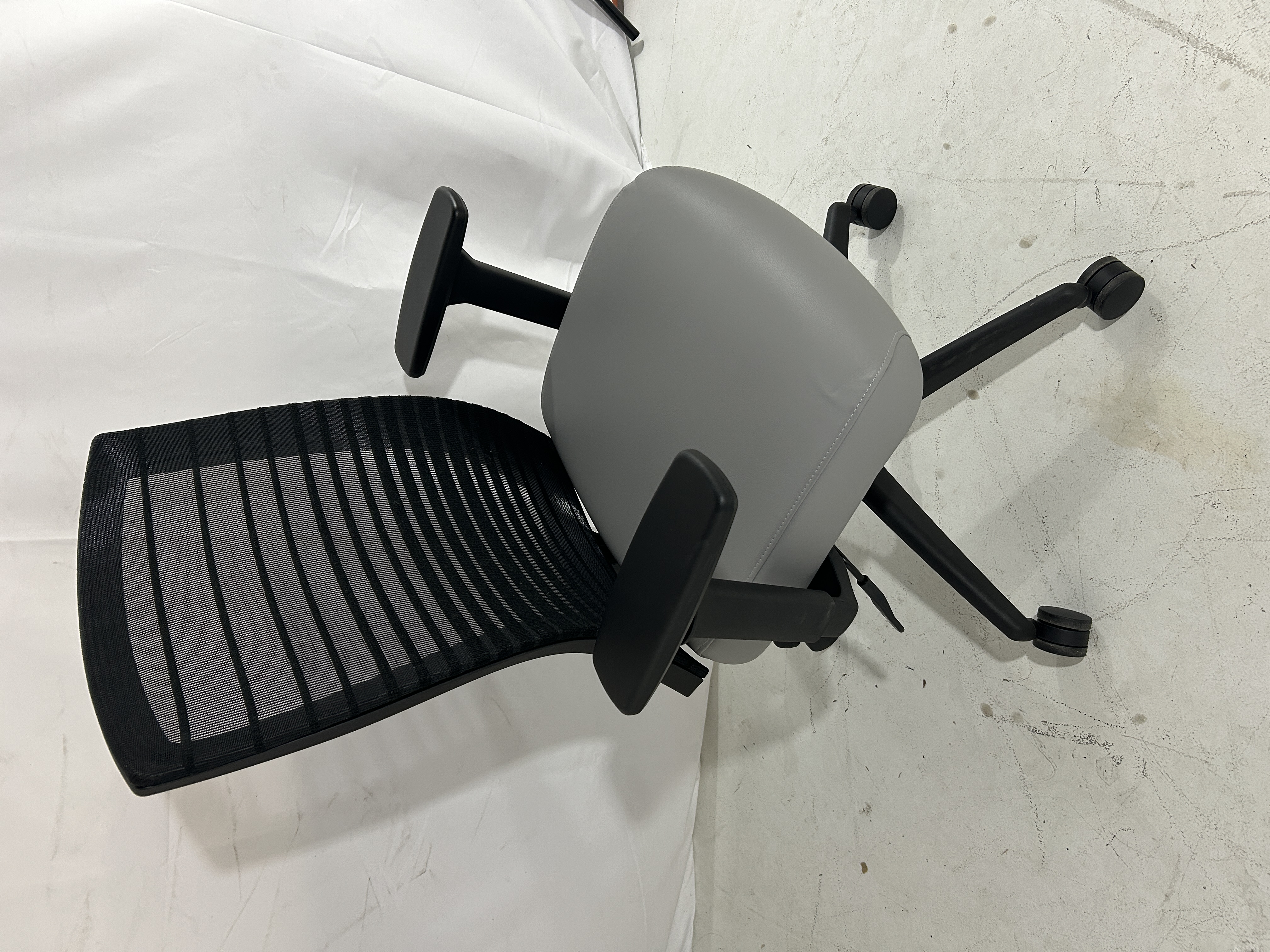 This sophisticated task chair features a breathable black mesh back and a generously upholstered grey vinyl seat.