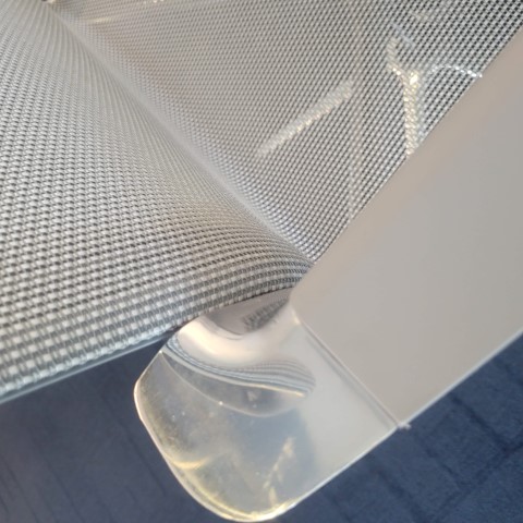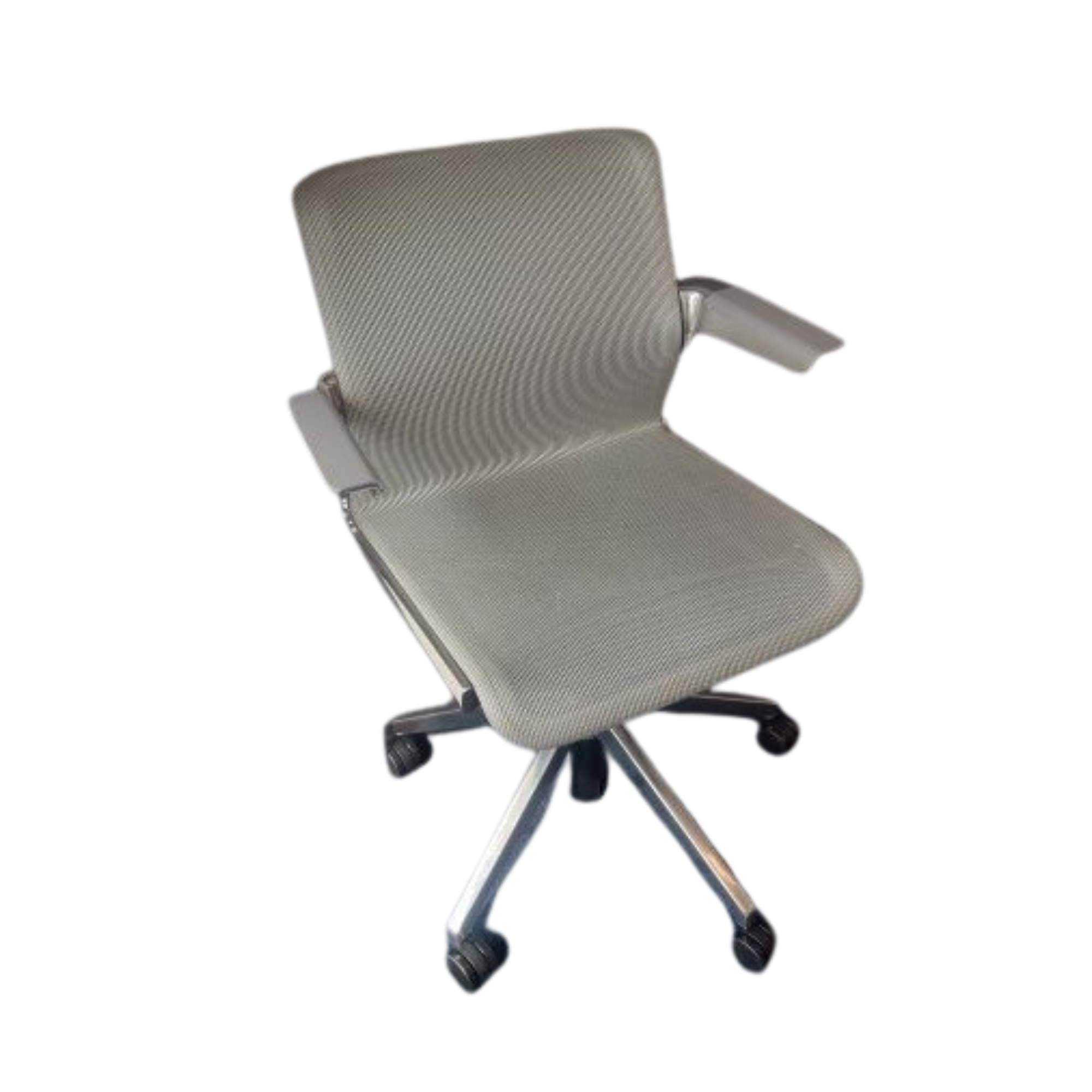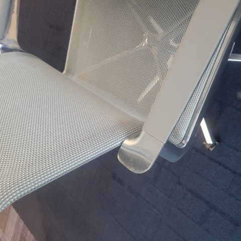 These Allsteel grey mesh chairs have a brushed aluminum frame with fixed arms and pneumatic height adjustment.