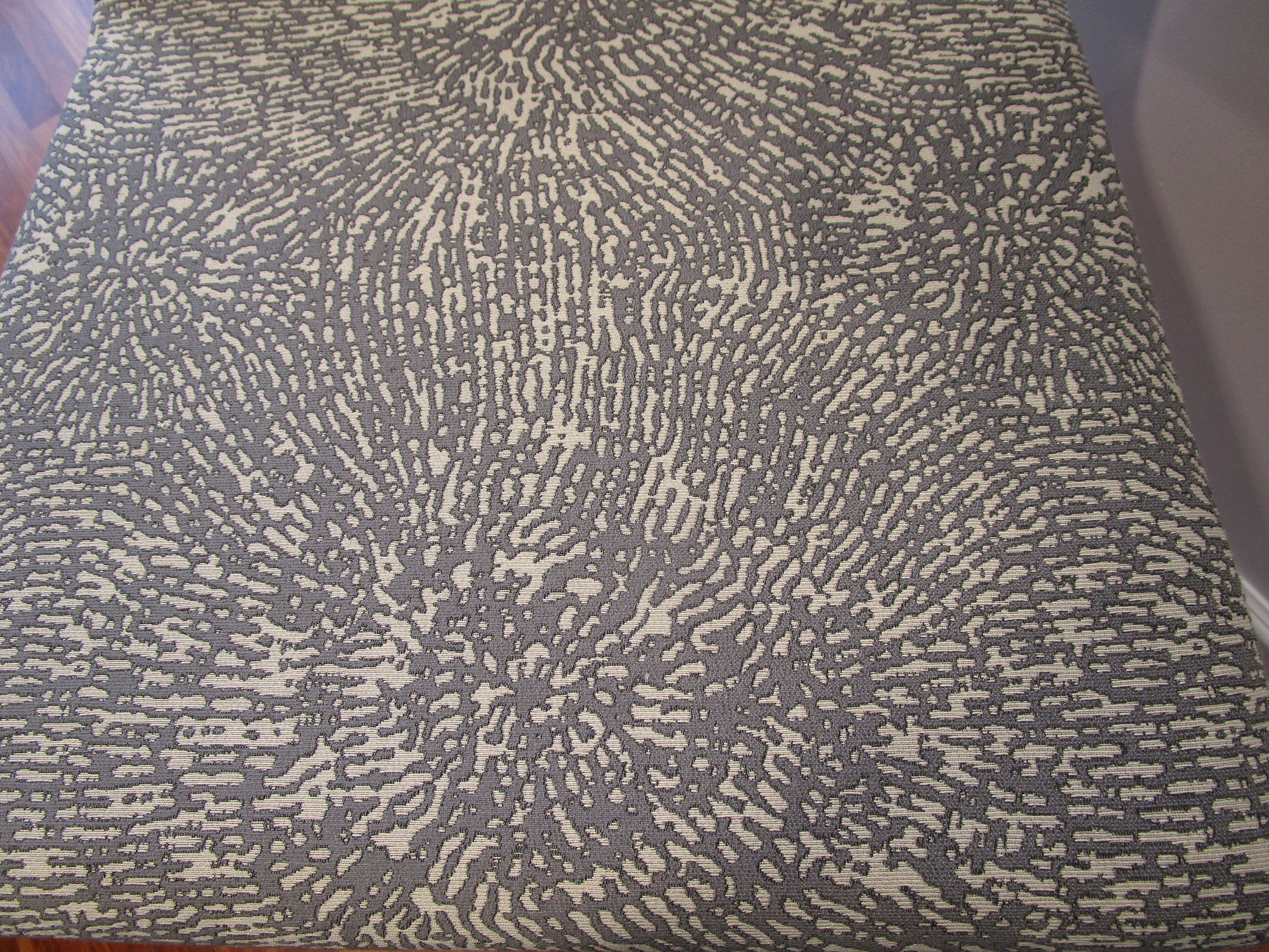 - Patterned gray fabric seat and back