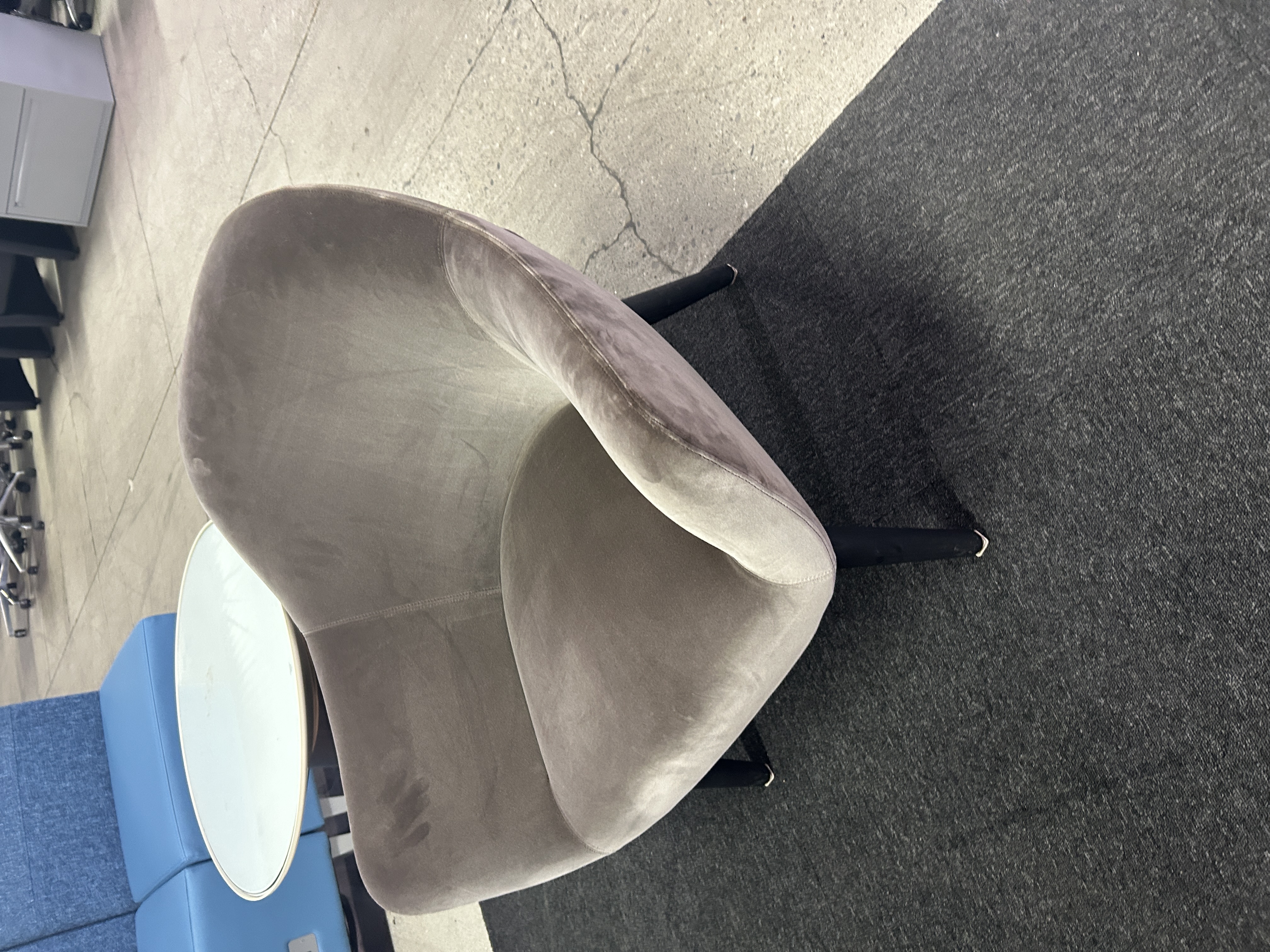 • Cozy, light gray velvet chair with sleek, curved design and sturdy black legs. The chair exudes comfort and modern elegance.