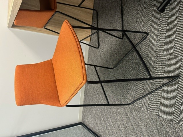 Add bold style and comfort with Steelcase Coalesse Monterra 650 stools. Featuring a chrome frame with an orange fabric seat and back, these stools are perfect for collaborative spaces, lounges, or modern cafés.