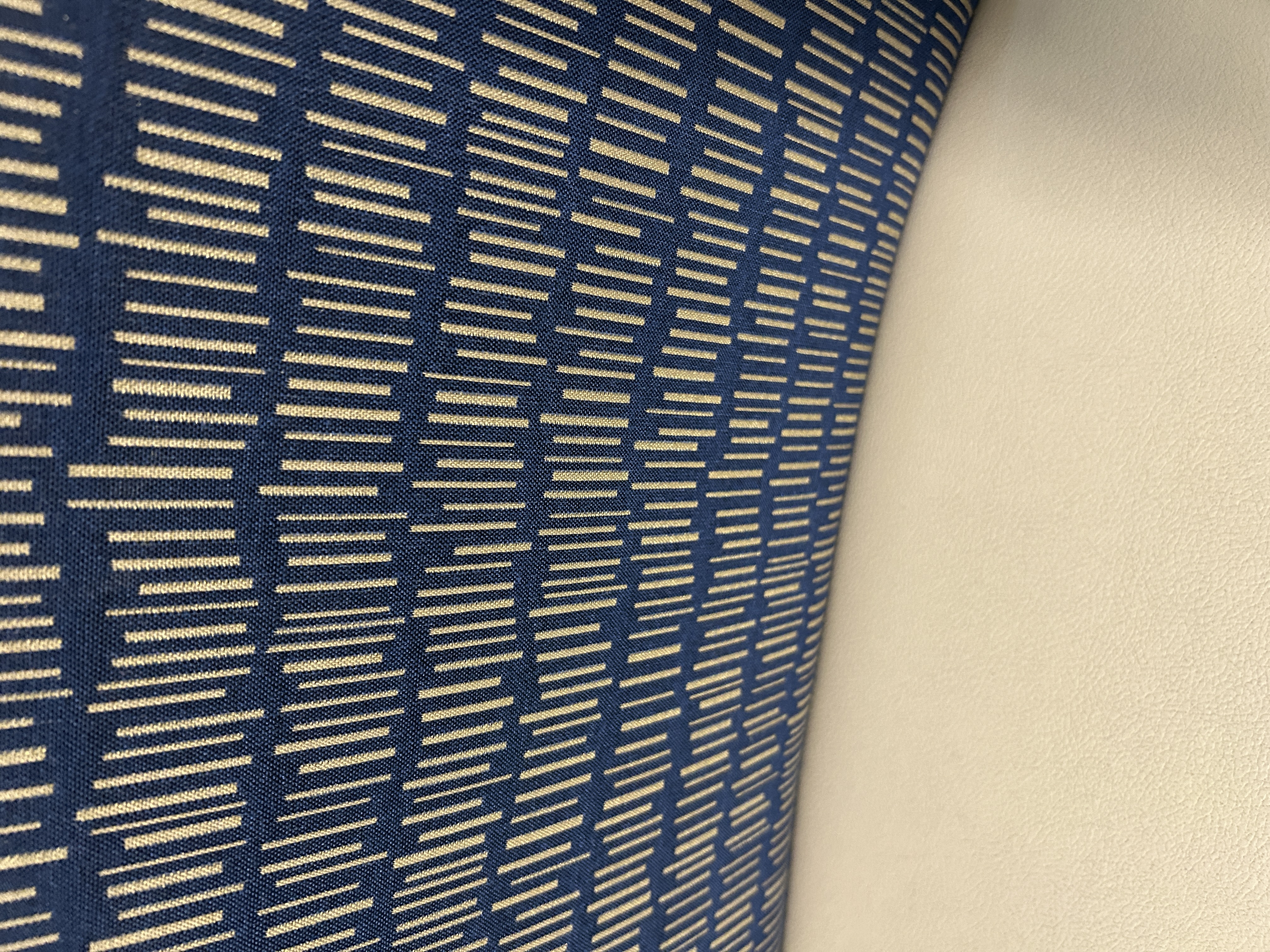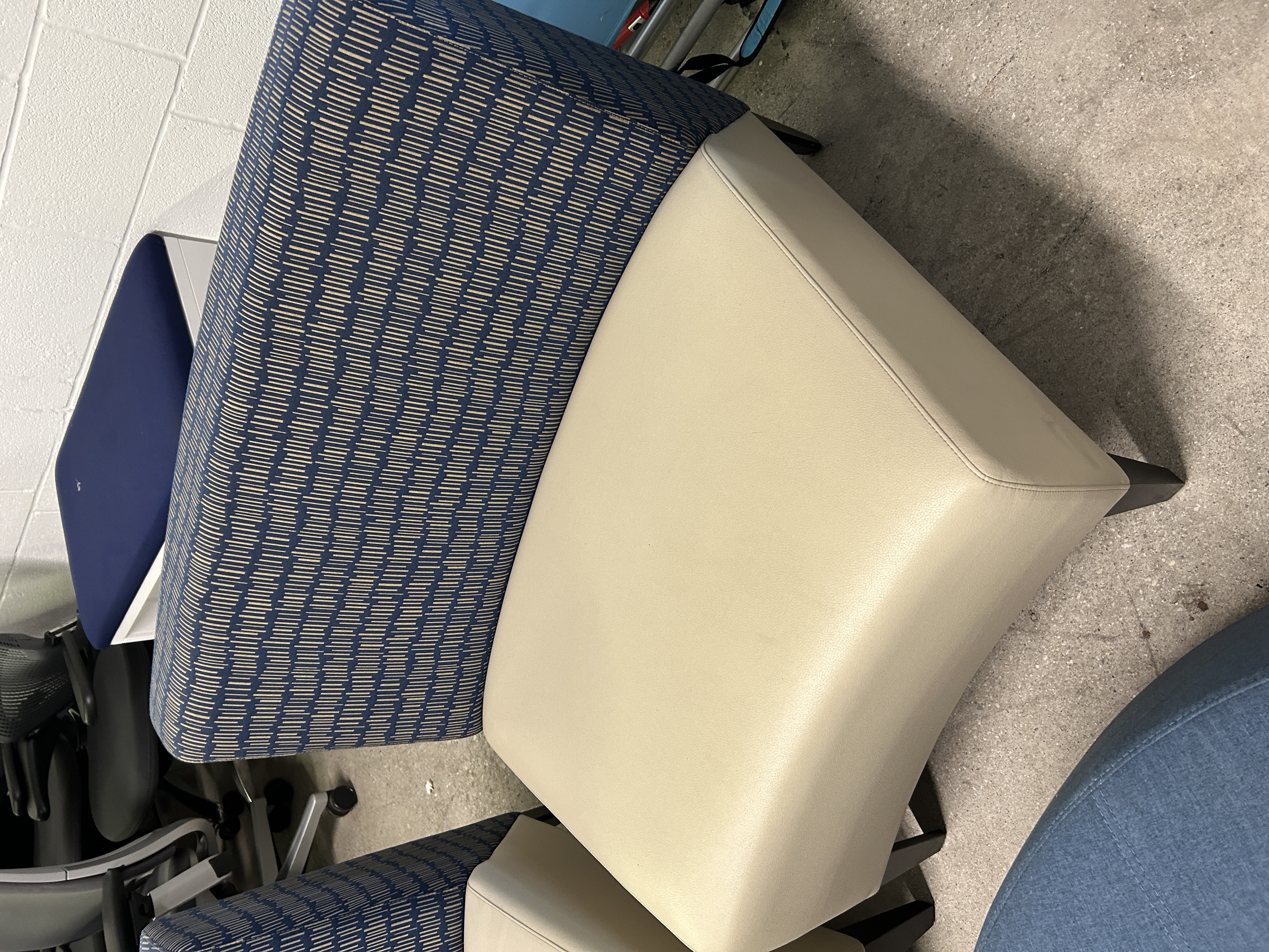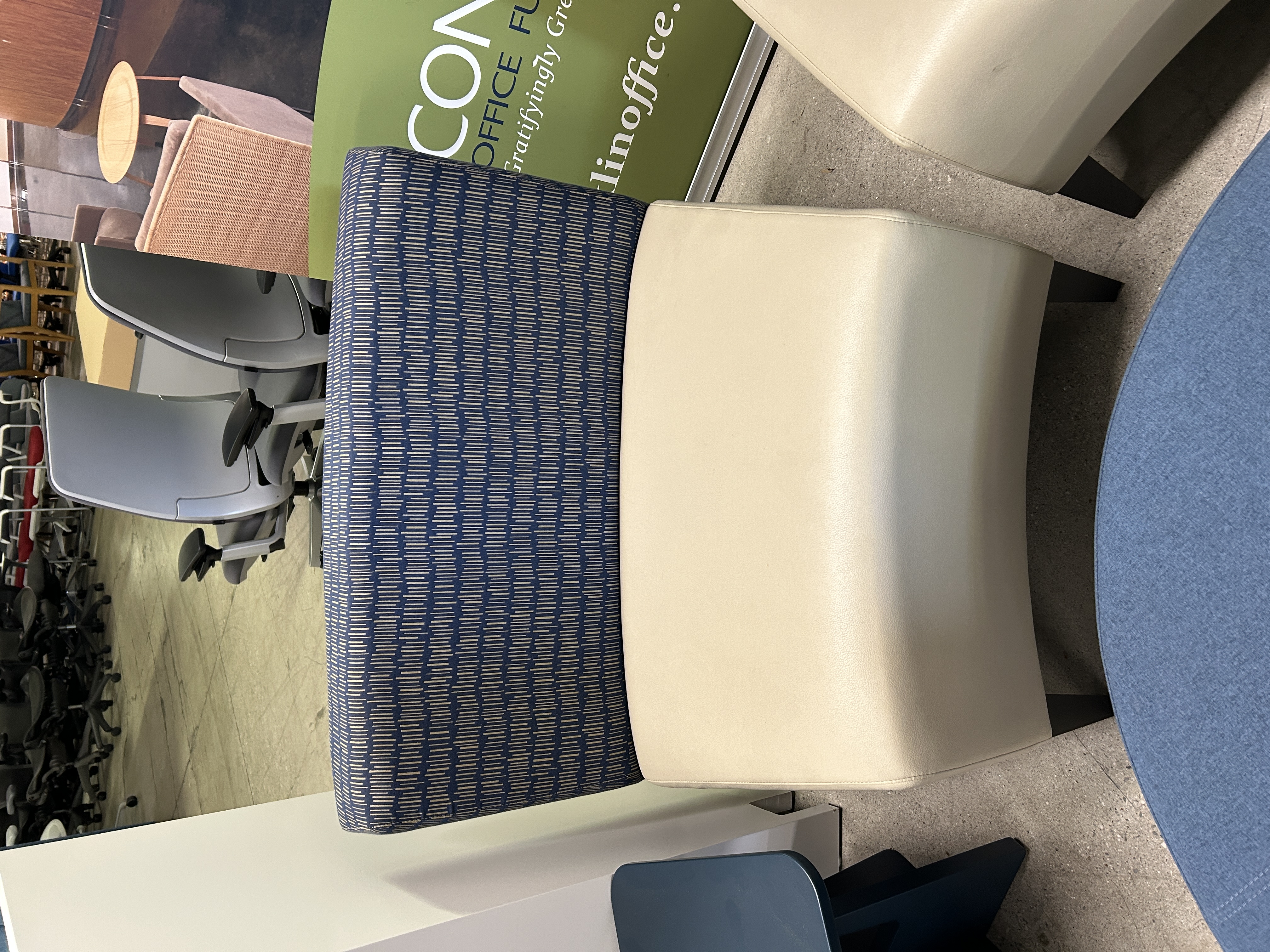 Elevate your lounge with the Steelcase Coalesse Sectional, blending a beige leather seat with a blue and gold script fabric back for a refined, modern look. Each modular piece offers comfort, flexibility, and durable construction—perfect for offices or reception areas.