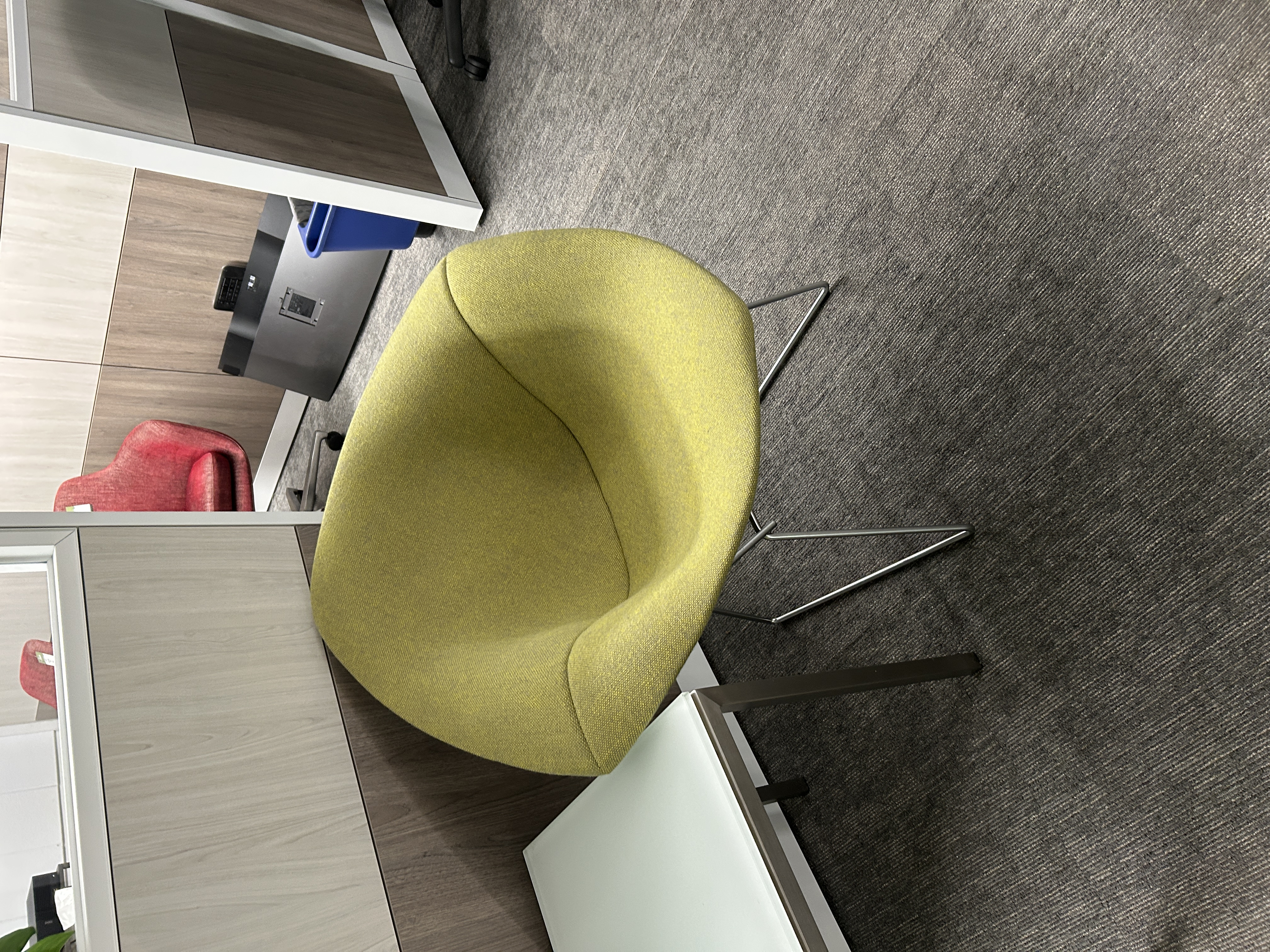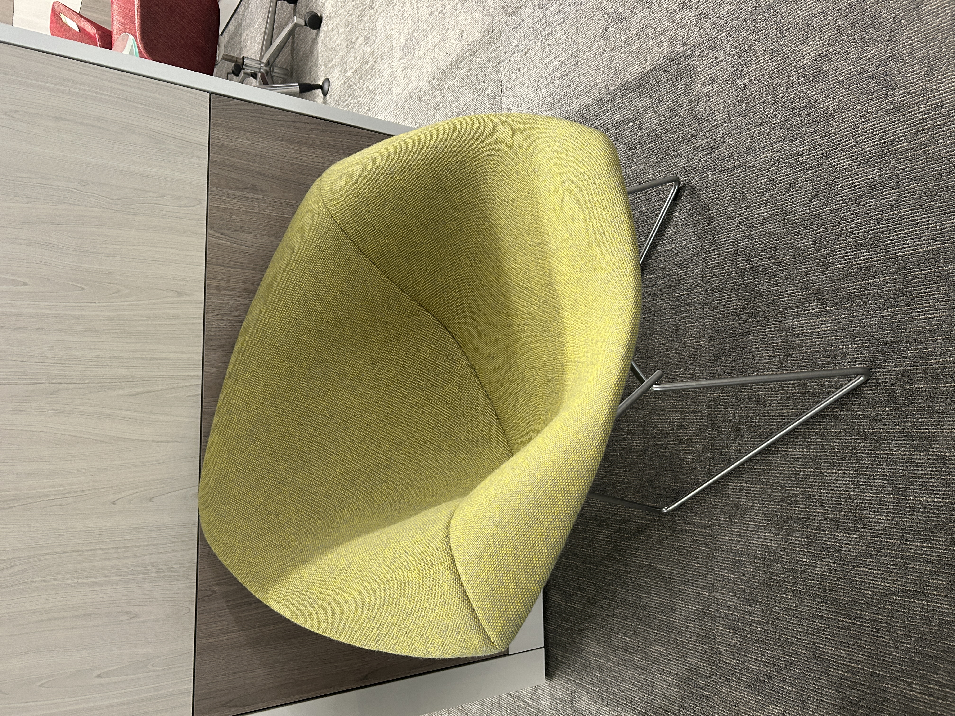 Experience iconic modern design with the Harry Bertoia lounge chair by Knoll. This signature piece features a polished chrome frame paired with a vibrant green fabric seat cushion, offering a sophisticated look and artistic appeal for any upscale environment.