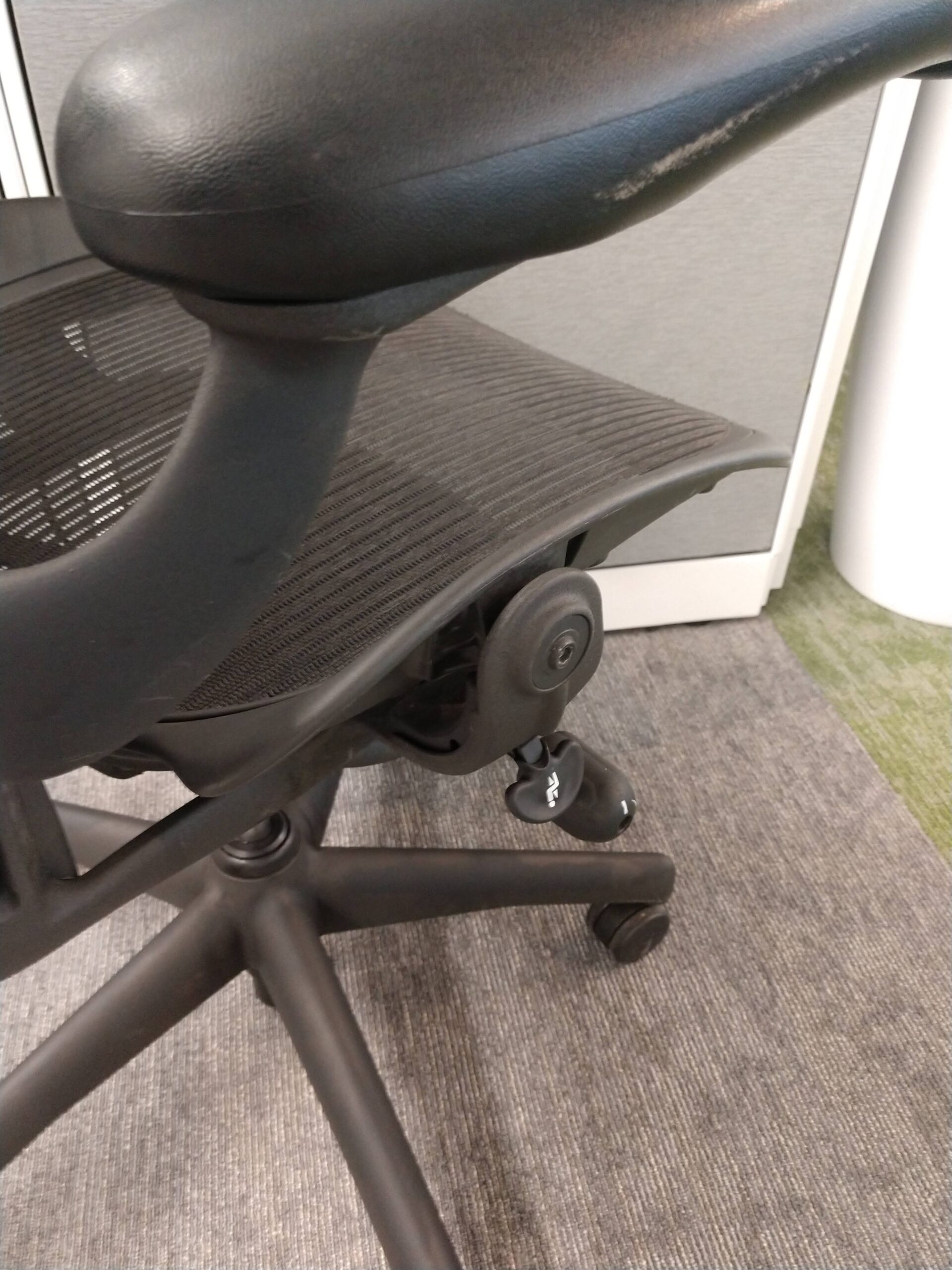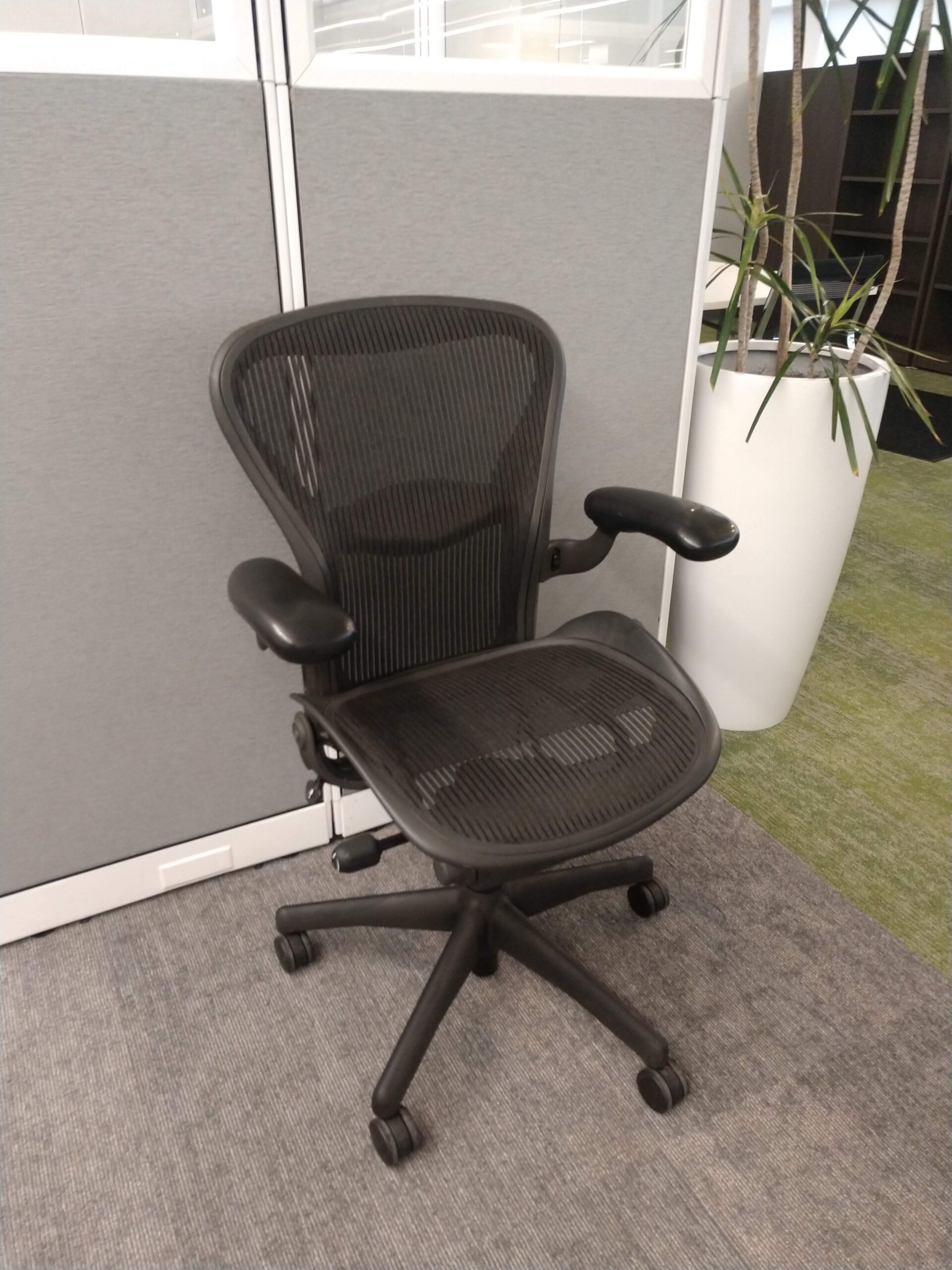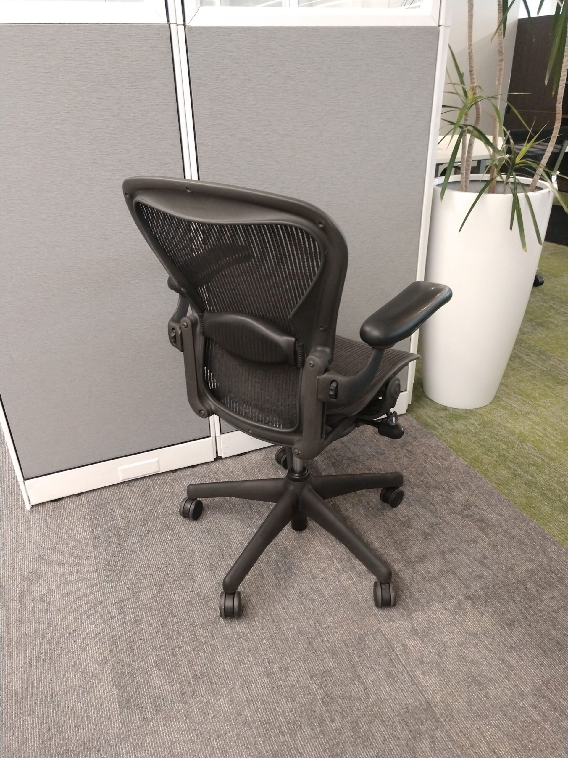 Upgrade your comfort with the Herman Miller Aeron Chair, Size C. Designed for larger users, it features breathable mesh, adjustable lumbar support, and fully adjustable arms for ergonomic excellence. The black frame adds sleek, professional appeal.