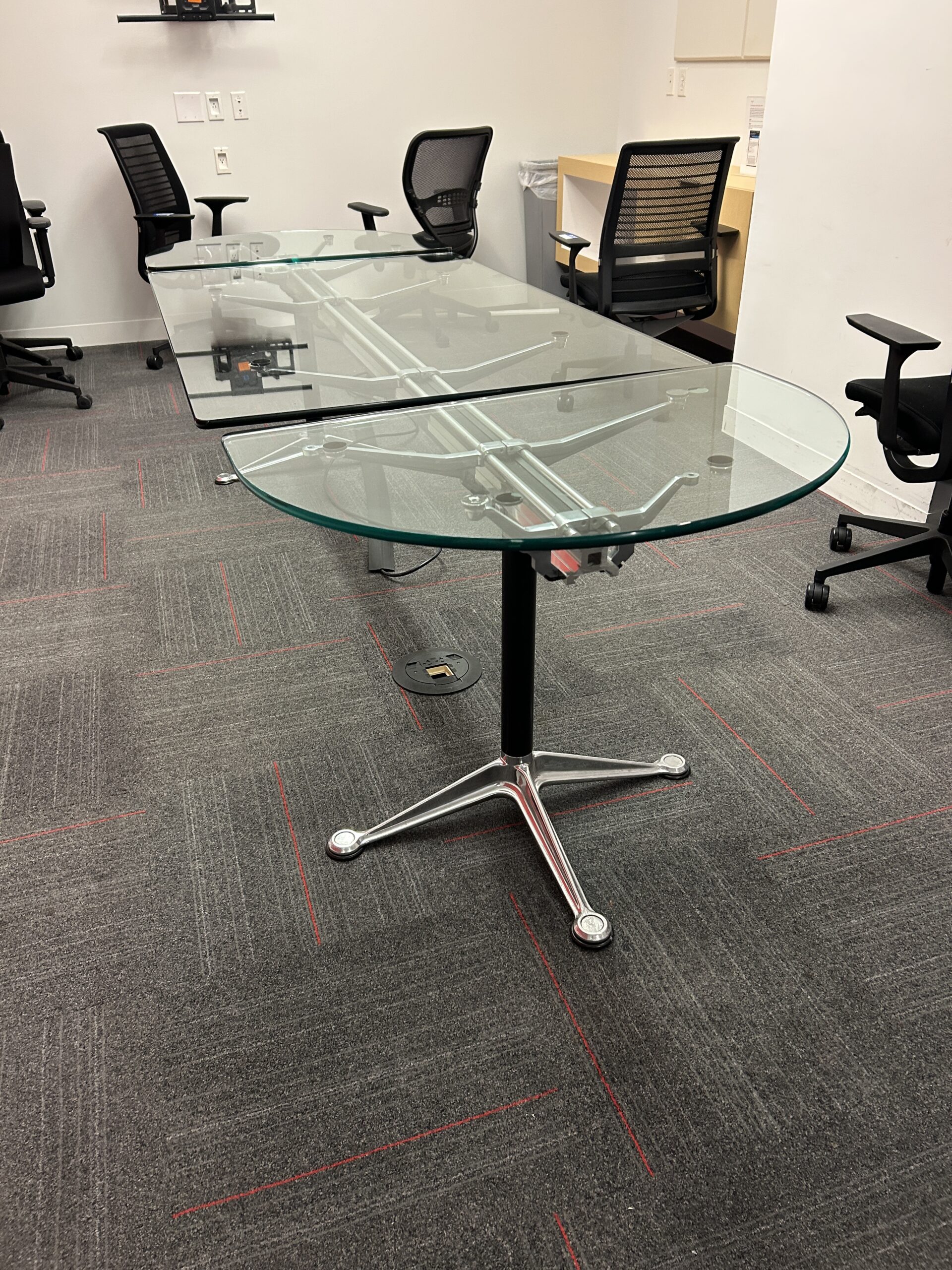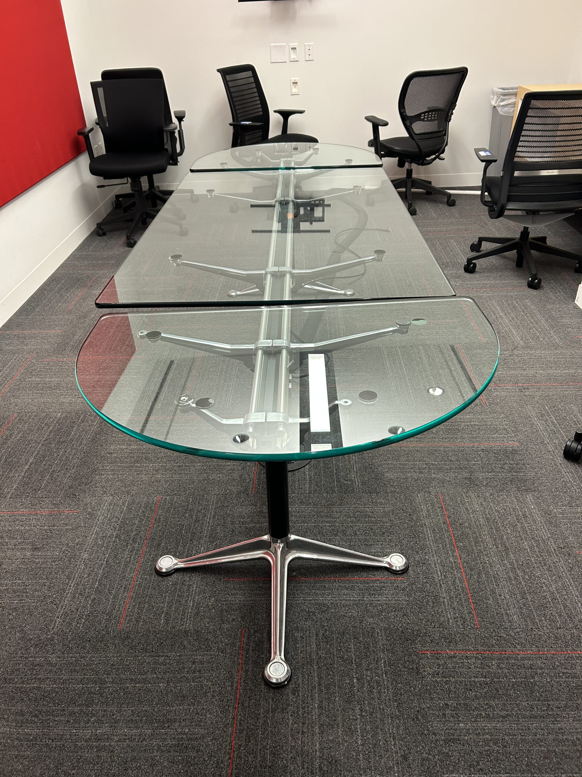 Elevate your conference or meeting space with this iconic Herman Miller Bruce Burdick glass table system. Designed by Bruce Burdick, the modular three‑piece glass‑top table is a striking blend of modern design and functional versatility. Often used as a collaborative surface in executive and creative environments, it reflects Burdick’s innovative approach to modular furniture systems originally developed for Herman Miller.