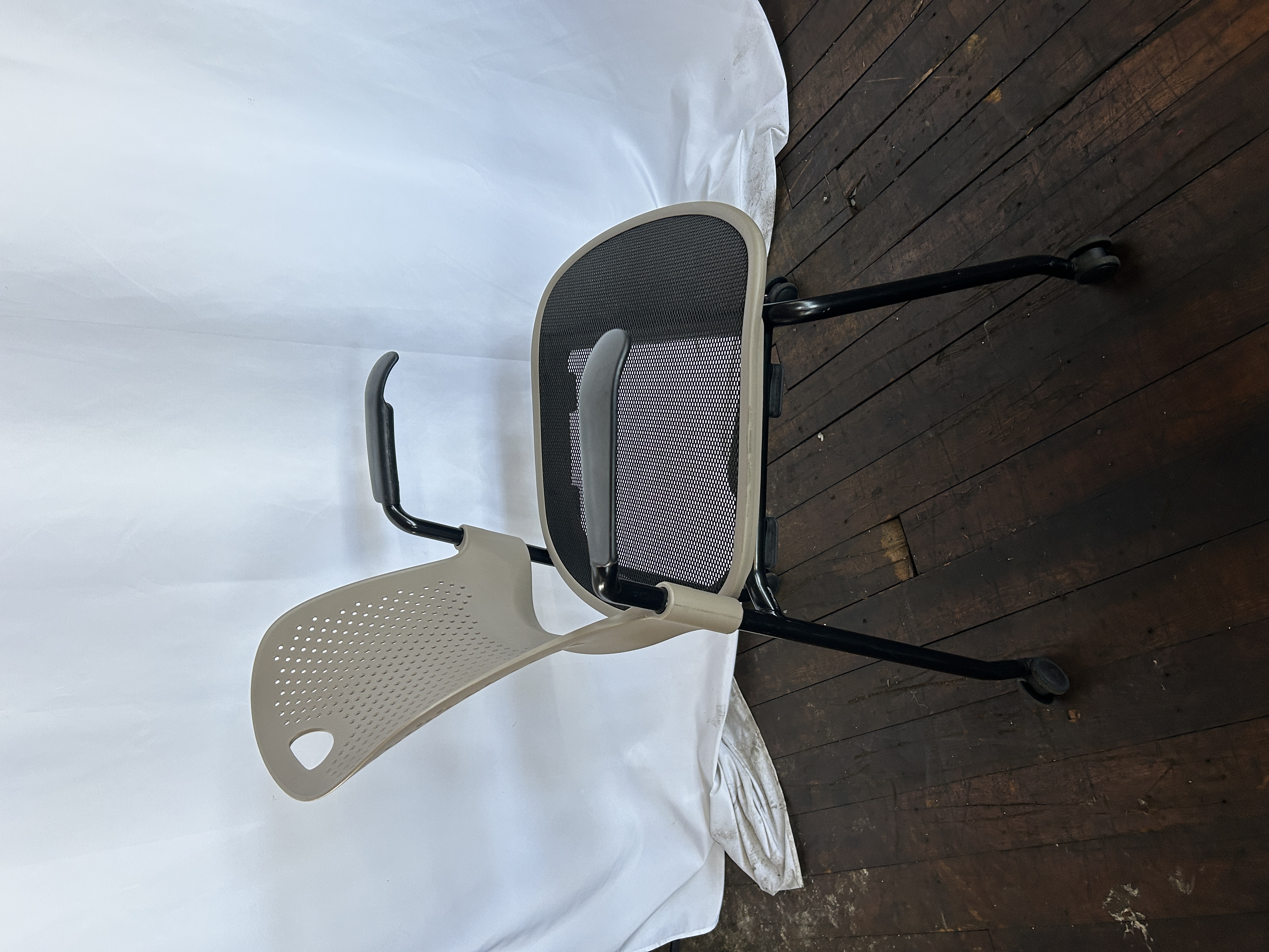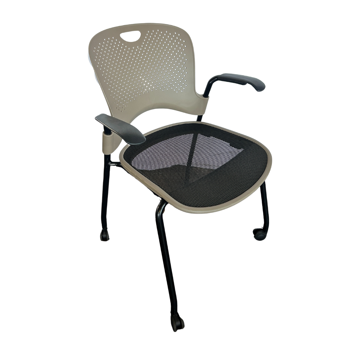 Enhance your workspace with the Herman Miller Caper Chair. Built for comfort and versatility, it features a breathable black mesh seat, briwb back, and sturdy black legs. Lightweight yet durable, it offers ergonomic support with a sleek, modern style ideal for multipurpose seating.