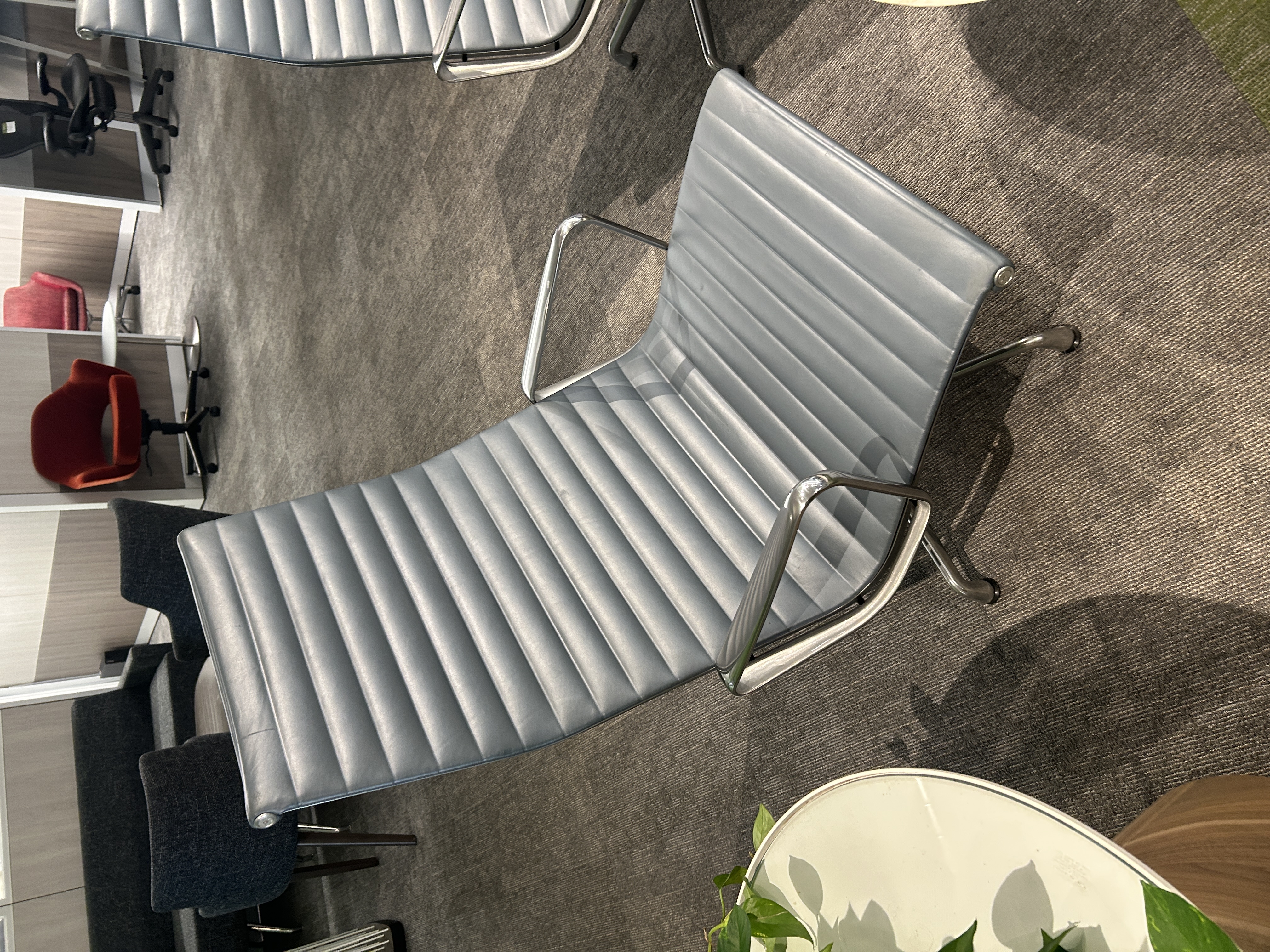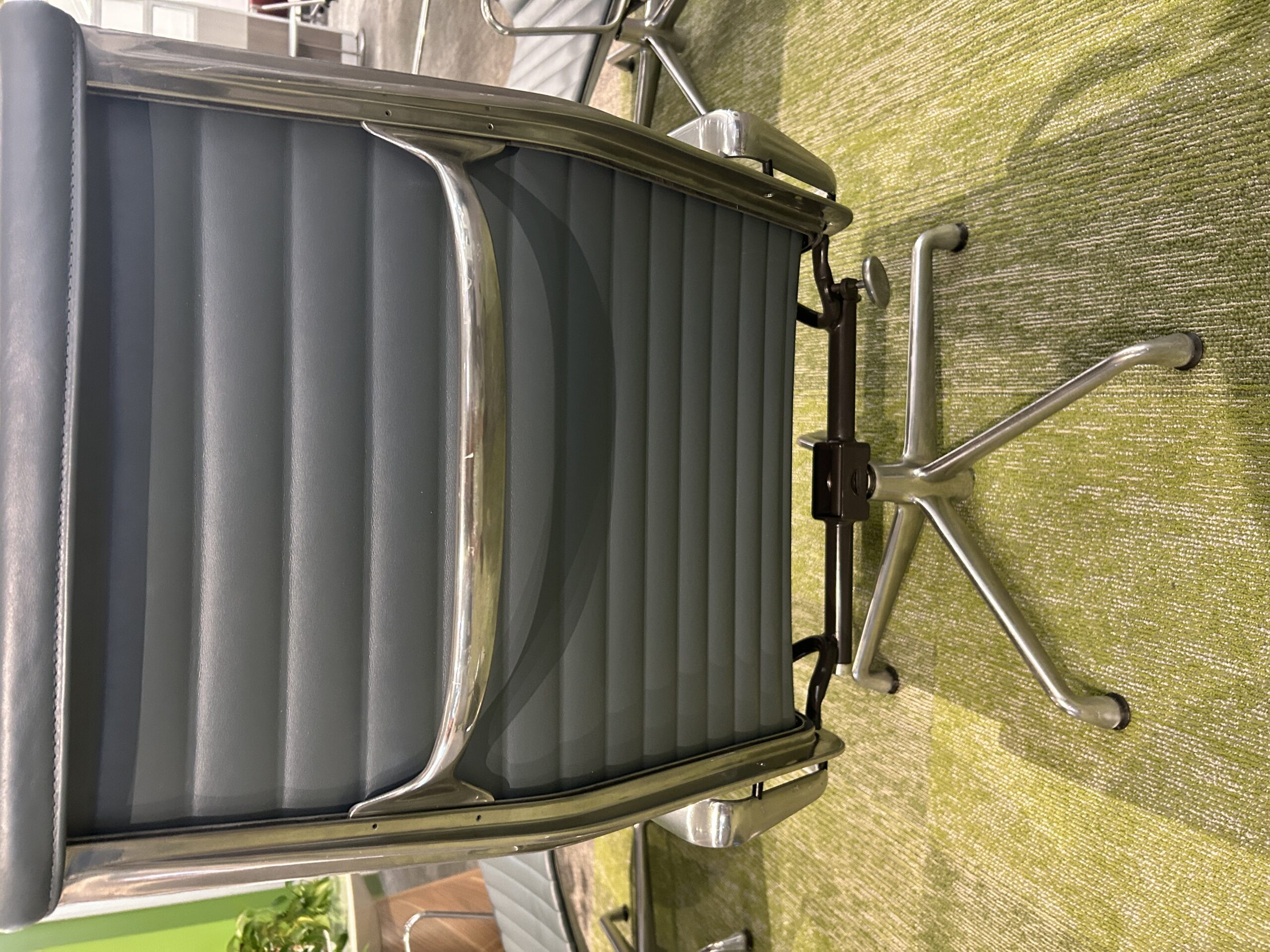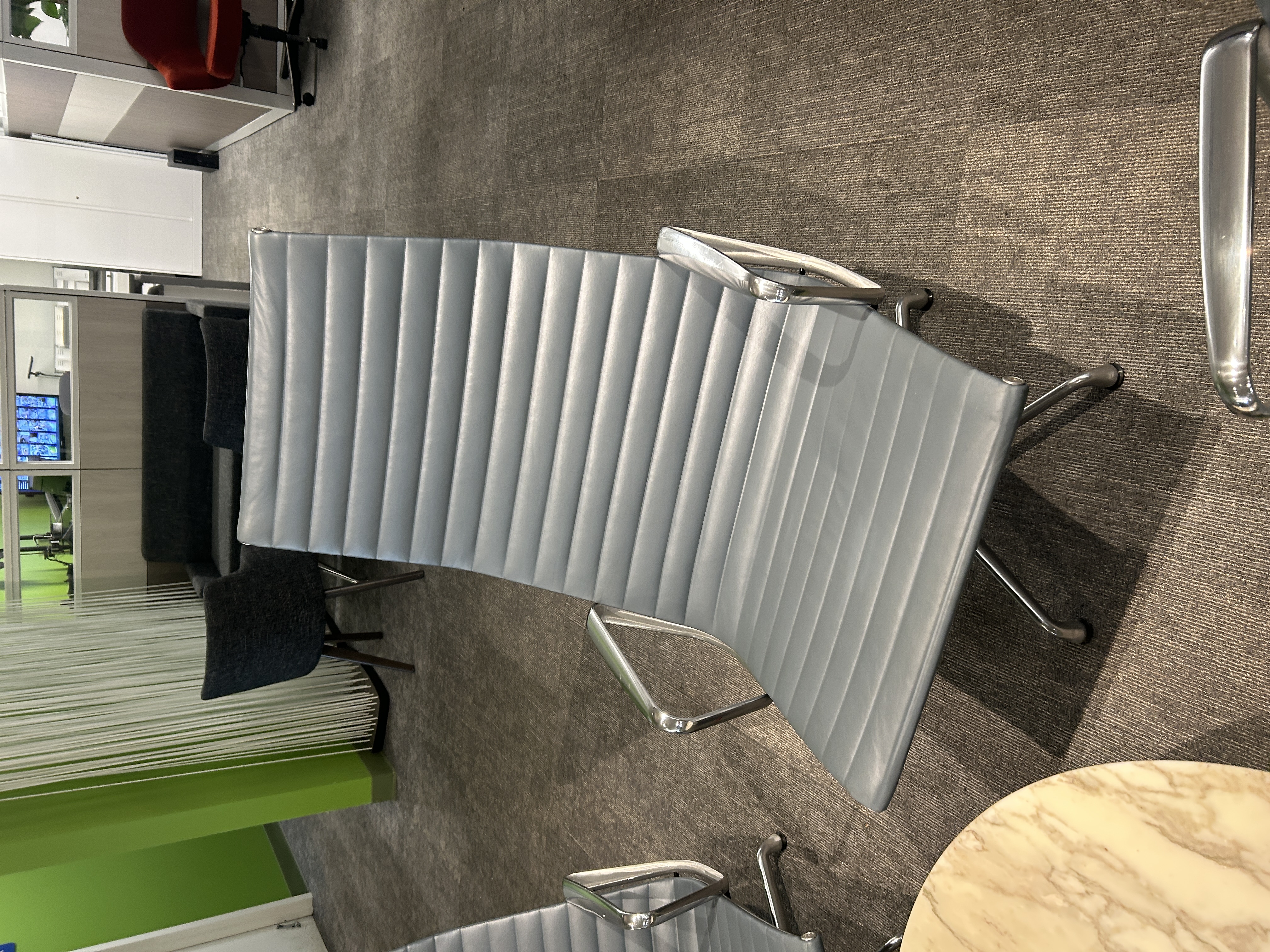Upgrade your workspace with the Herman Miller Eames High Back Chair in Slate Blue Leather. Featuring premium leather upholstery and a sleek aluminum frame, it blends timeless mid-century design with modern ergonomic comfort, perfect for executive offices or stylish home setups.