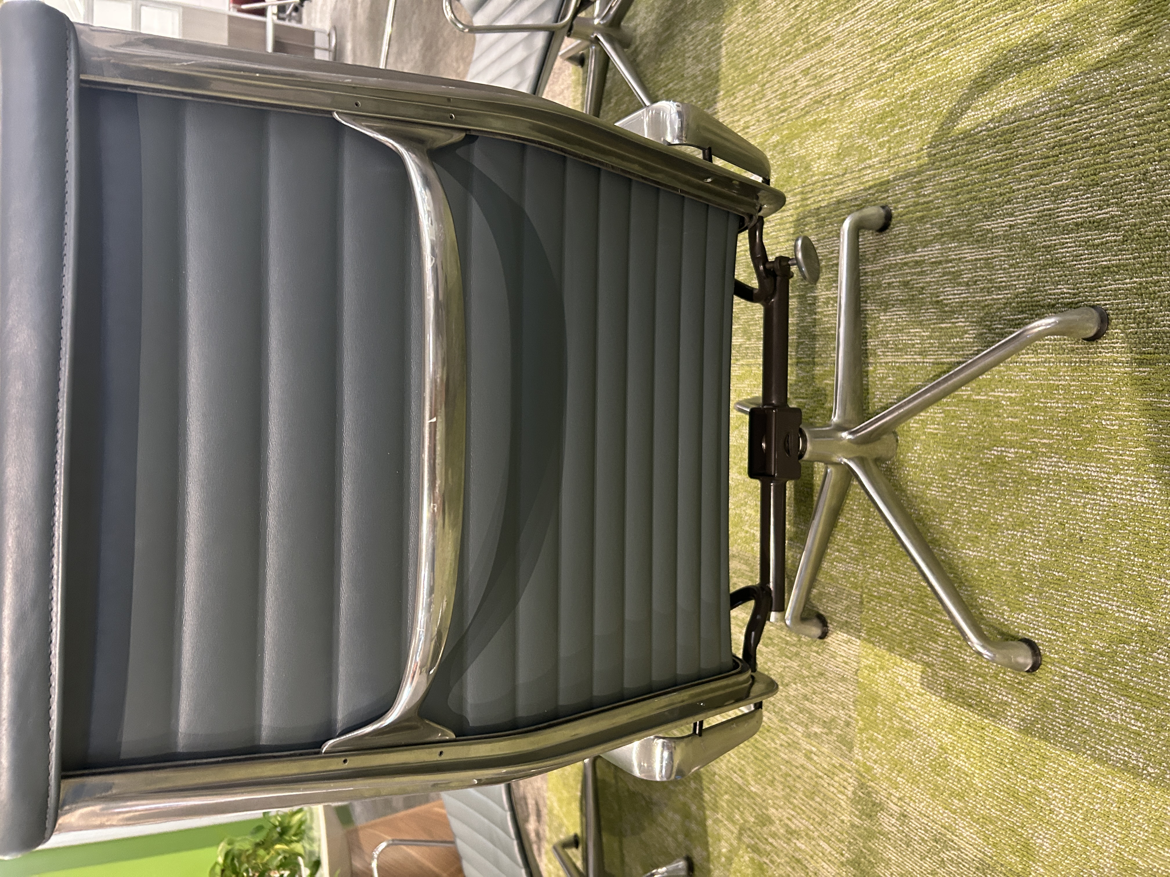 Upgrade your workspace with the Herman Miller Eames High Back Chair in Slate Blue Leather. Featuring premium leather upholstery and a sleek aluminum frame with a pillow, it blends timeless mid-century design with modern ergonomic comfort, perfect for executive offices or stylish home setups.