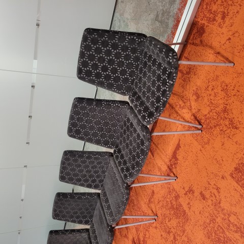 These armless Keilhauer Cahoots chairs have a patterned charcoal and blue/grey fabric.