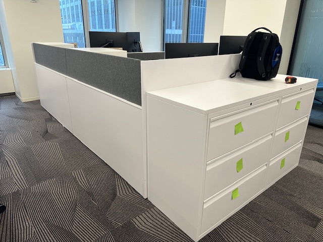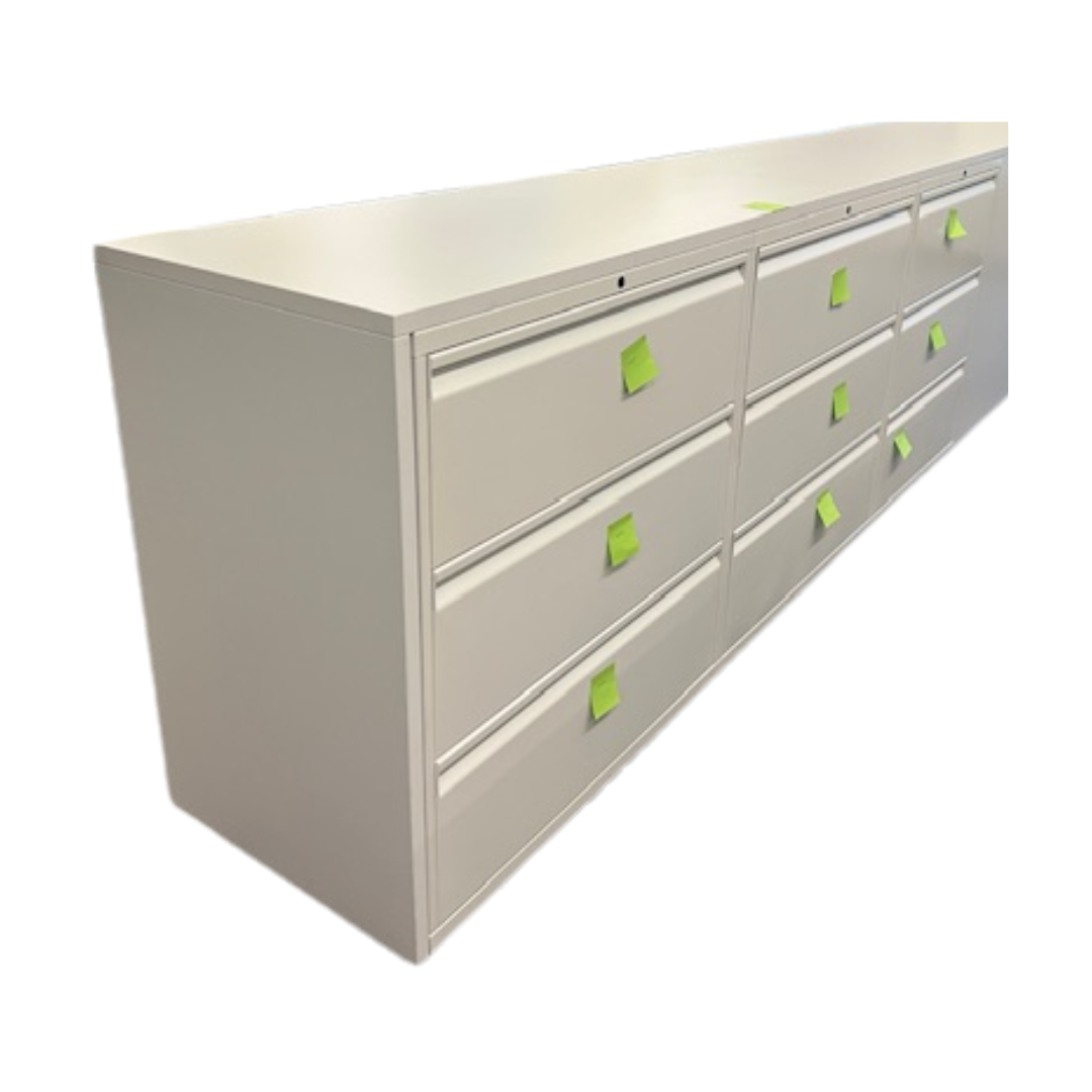 Elevate your storage efficiency with the Knoll Calibre Lateral Files. These sleek white metal units feature three locking drawers and a durable worktop surface, providing a professional and fully loaded solution to increase personal adjustment and comfort in any office setting.