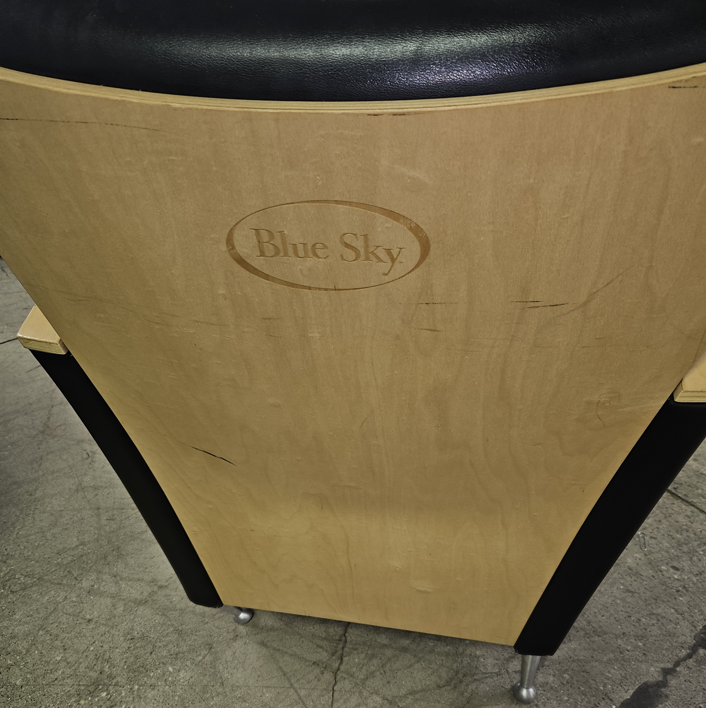 Source International black leather club chairs feature rounded tablet arms with maple surfaces and accents, combining classic comfort with functional style.