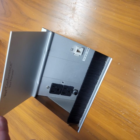 This Neinkamper meeting table measures 8′ square with two powered grommets on the surface.