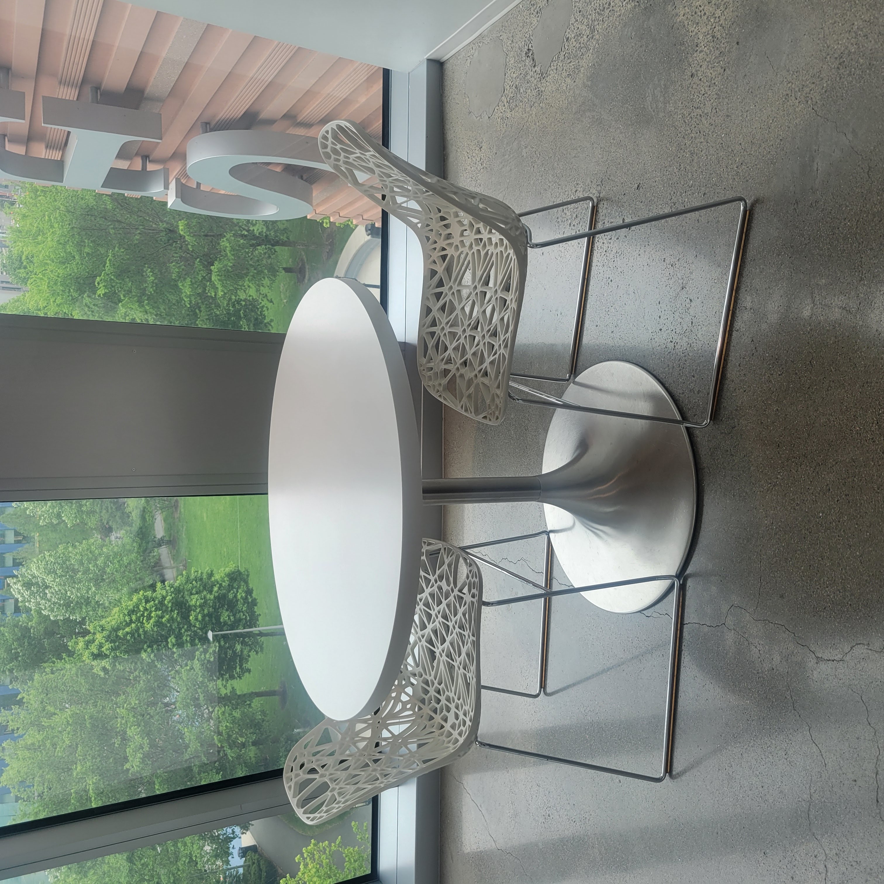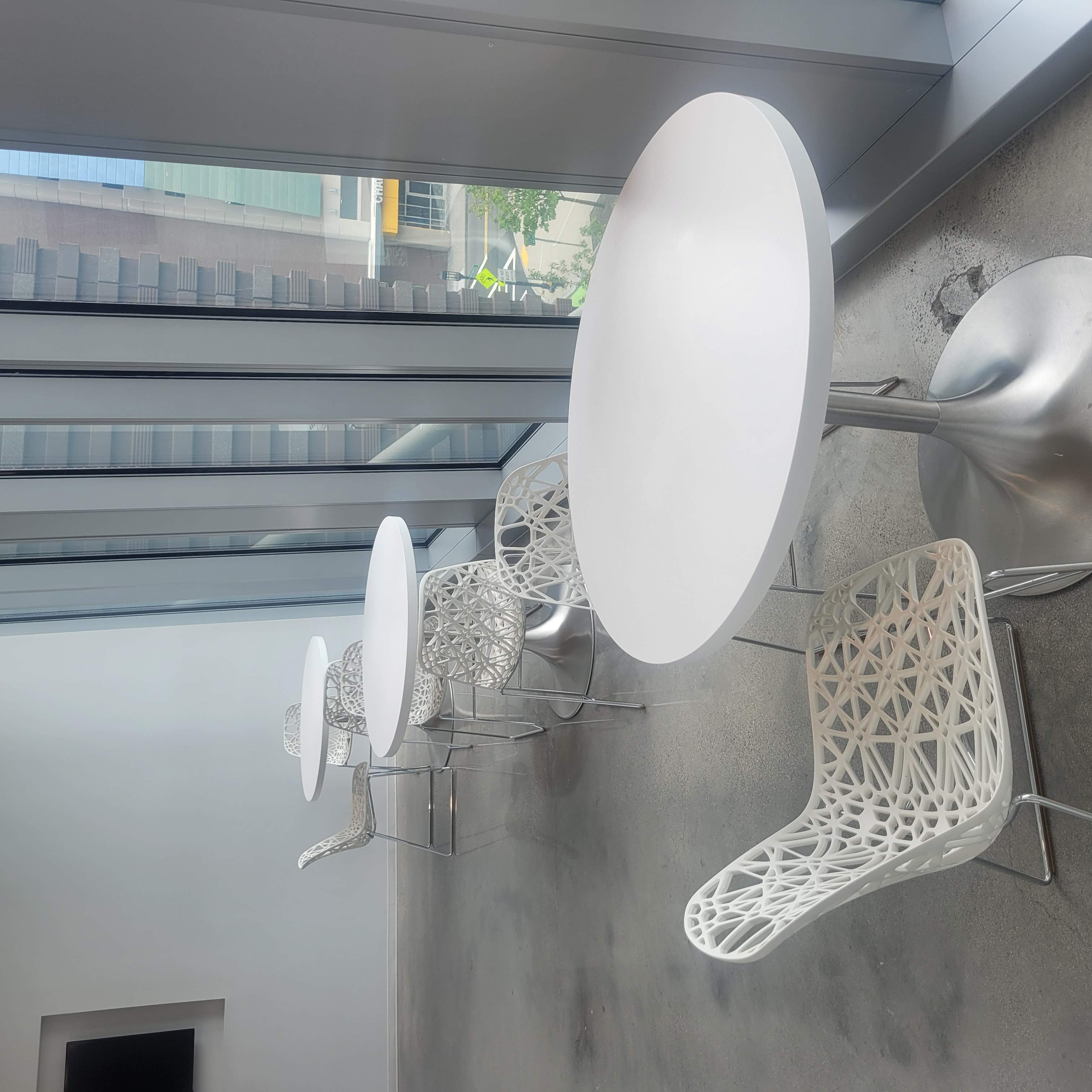 Add modern flair to any space with these OFS 36″ Round Laminate Cafe Tables. Featuring a crisp white laminate top and elegant tulip base, they offer clean lines and contemporary style at a comfortable 31 1/2″ height—ideal for dining or collaborative spaces.