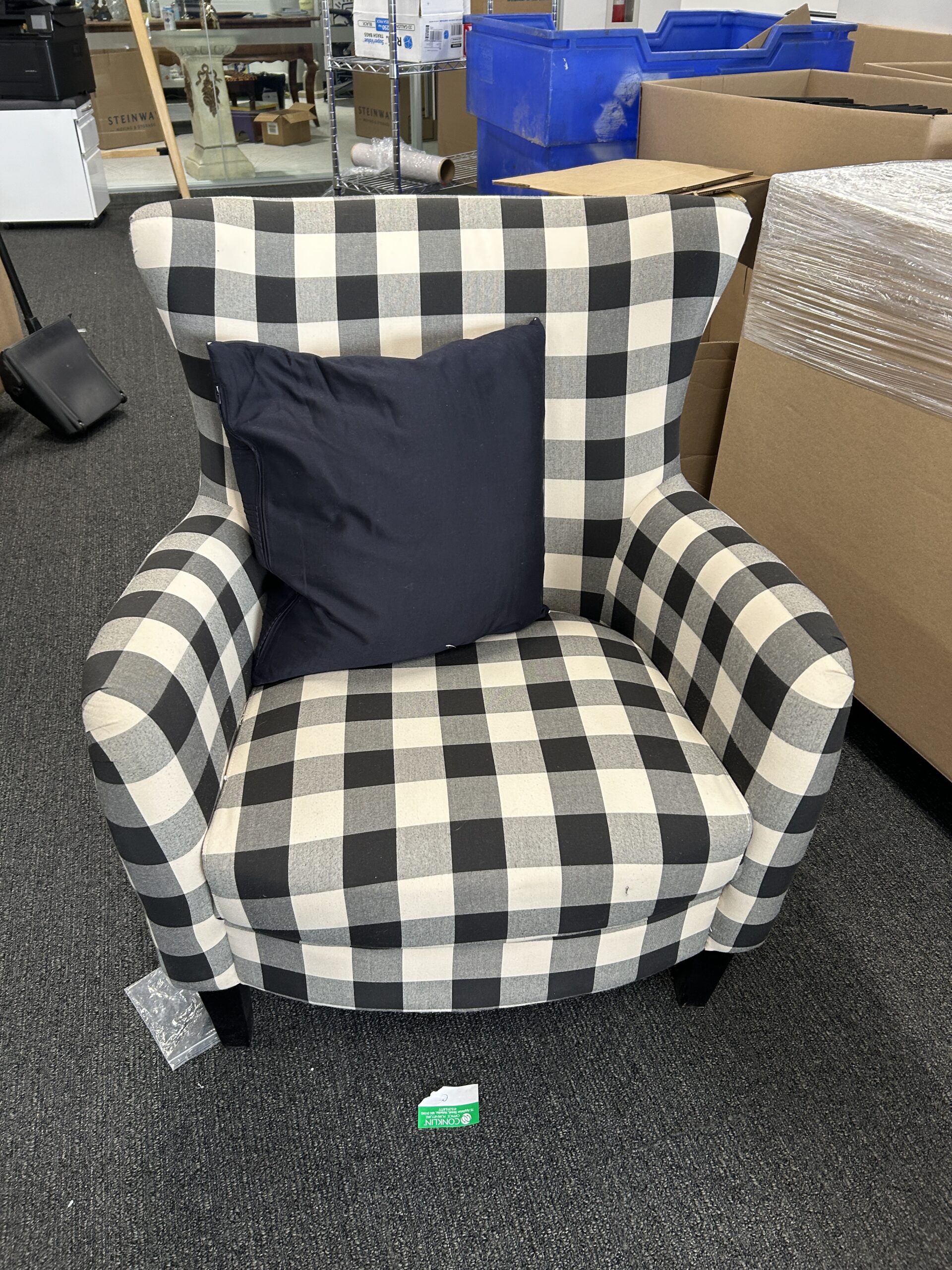 Elevate your lounge area with the Plaid Club Chair. This stylish piece features a bold white and black buffalo plaid fabric upholstery and a classic wingback-inspired silhouette. Supported by tapered black wood legs, it provides a comfortable and sophisticated seating option for reception areas, executive offices, or modern collaborative spaces.