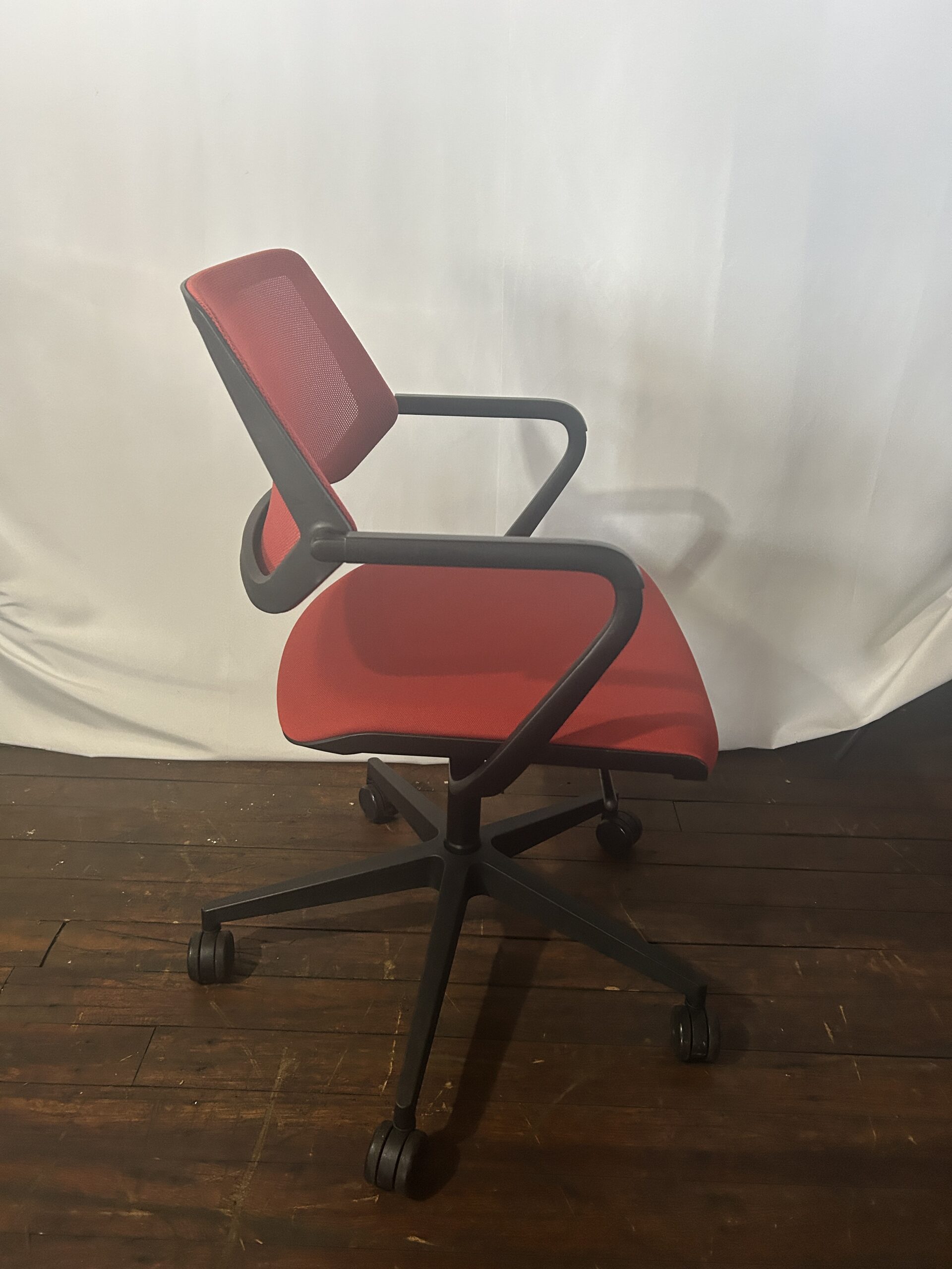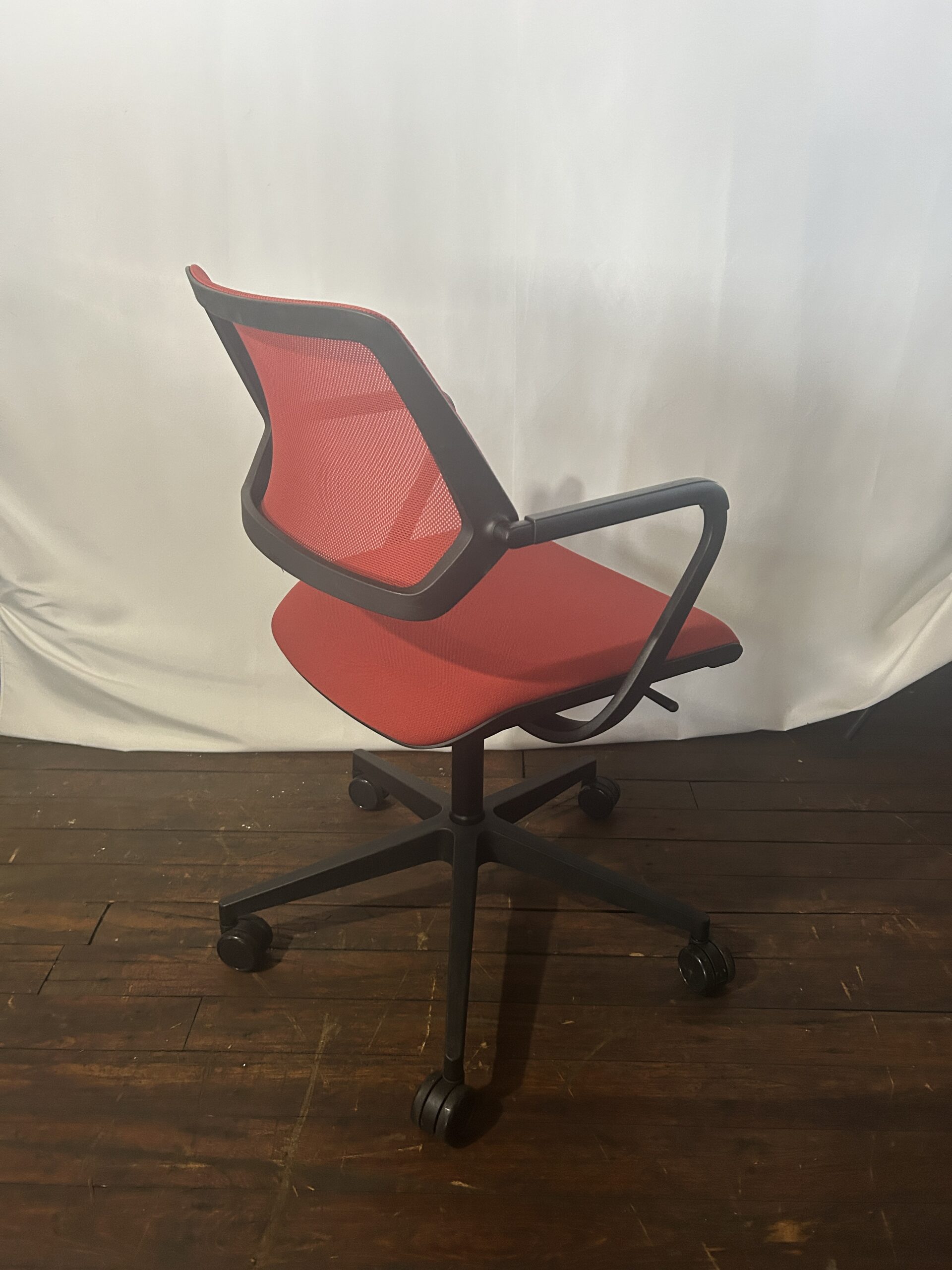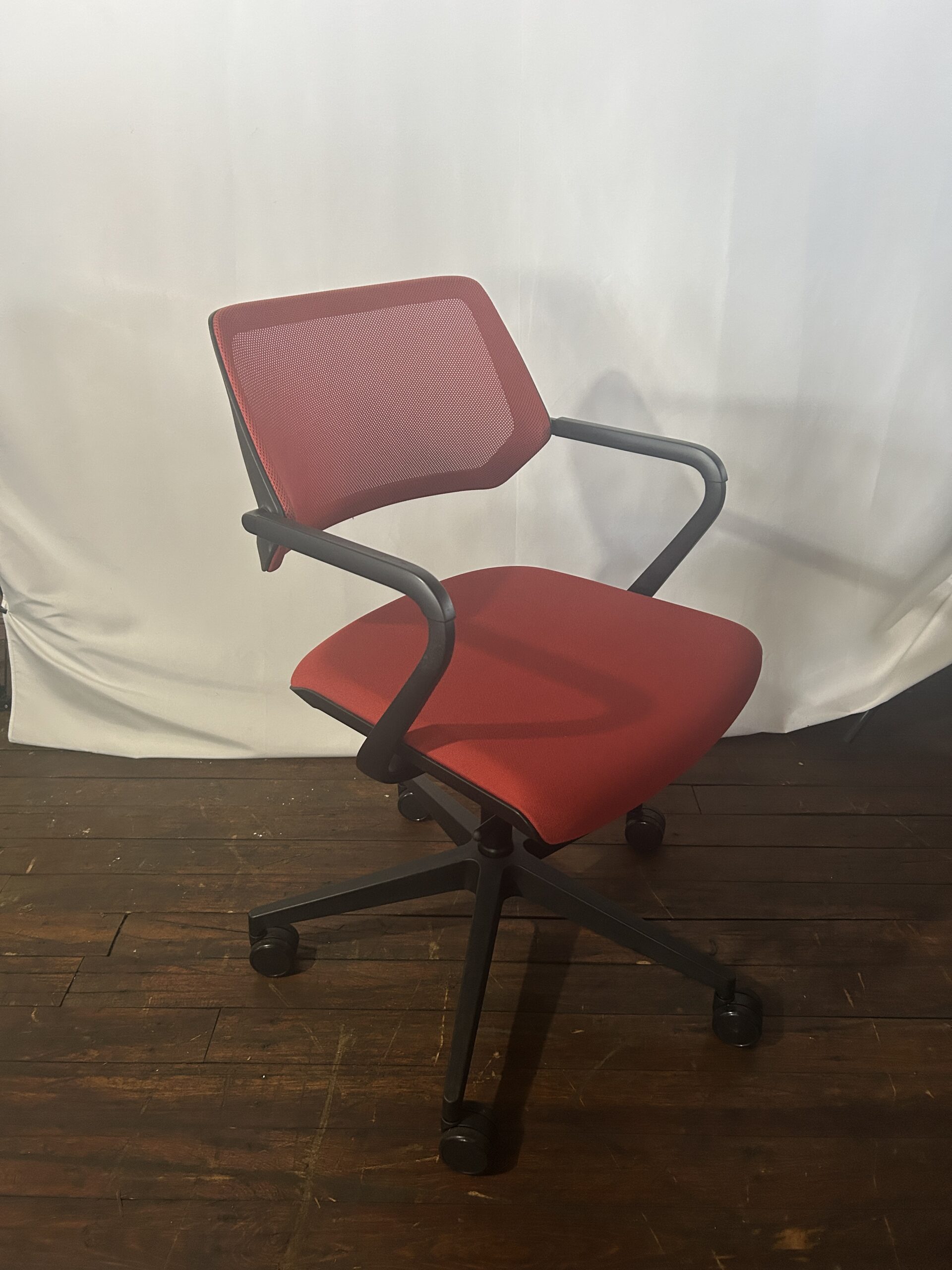Upgrade your workspace with the Steelcase Qivi Chair in vibrant red. Featuring a breathable mesh back and cushioned seat, it delivers ergonomic comfort, modern style, and flexible support for collaborative office environments.