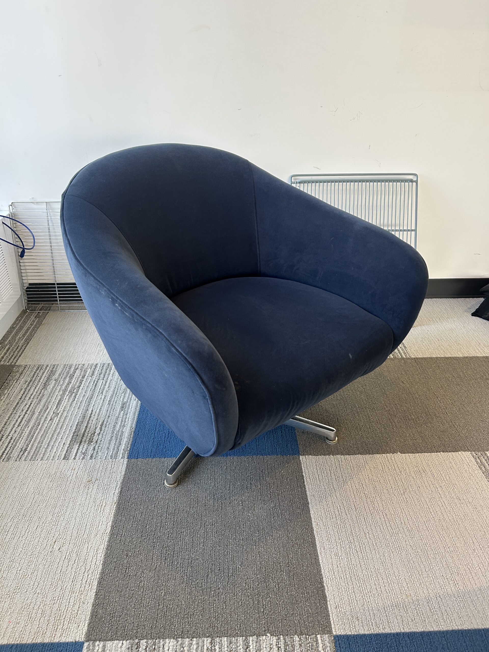 Bring a professional touch to your lounge area with the Room and Board Blue Club Chair. This elegant piece features deep navy velvet upholstery and a curved silhouette, offering premium comfort and a modern aesthetic. Its sturdy four-star metal base provides stability, making it a perfect addition to executive offices, reception areas, or high-end collaborative spaces.