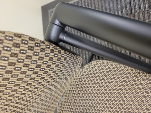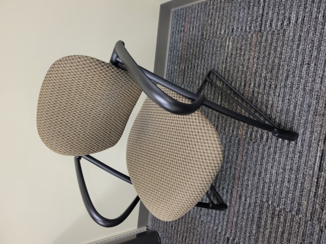 These Steelcase Ally side chairs have a black frame a patterned fabric seat and back. These chairs are stackable and they rock!