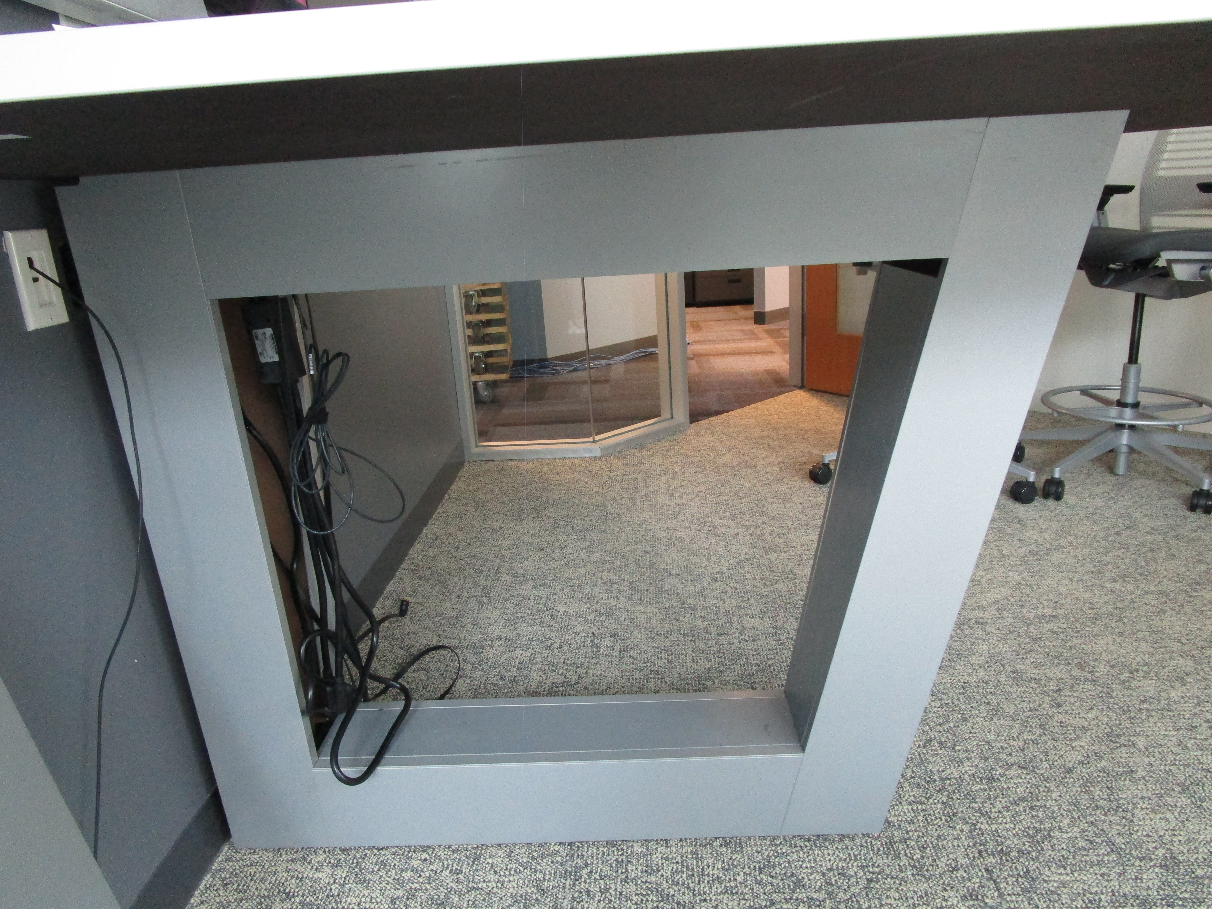 Create a central hub for your team with the modern Steelcase Half Oval Conference Table. Featuring a crisp white laminate top and a sturdy gray painted steel base, this contemporary table is designed for collaborative meetings and boardroom presentations, combining signature Steelcase durability with a sleek, professional look. Please note this table anchors to the wall.