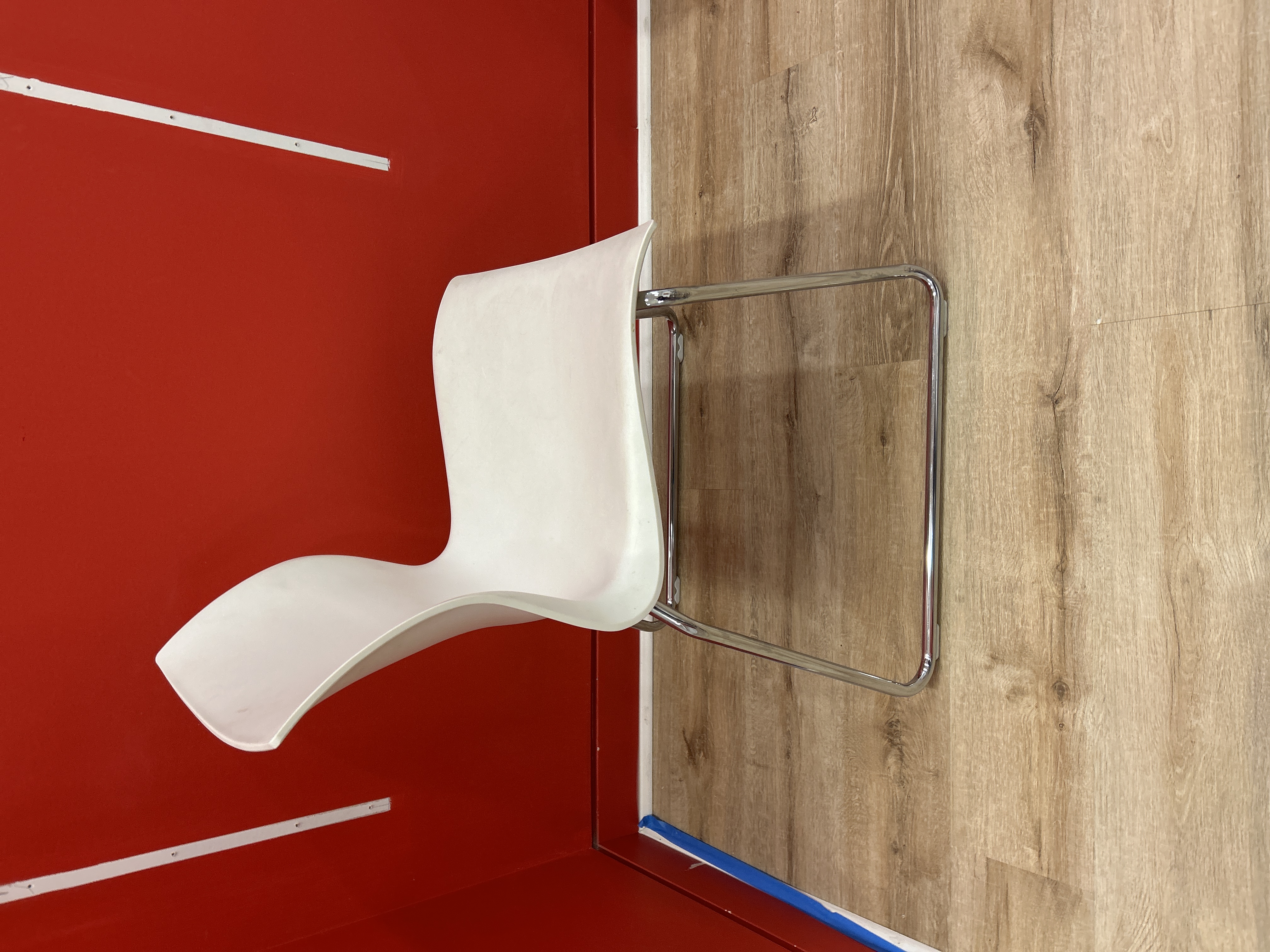 Streamline your space with the Teknion Nami White Stacking Side Chair. Featuring a sleek white shell and chrome sled base, it combines minimalist design with durable functionality—perfect for guest, training, or multi-use areas.