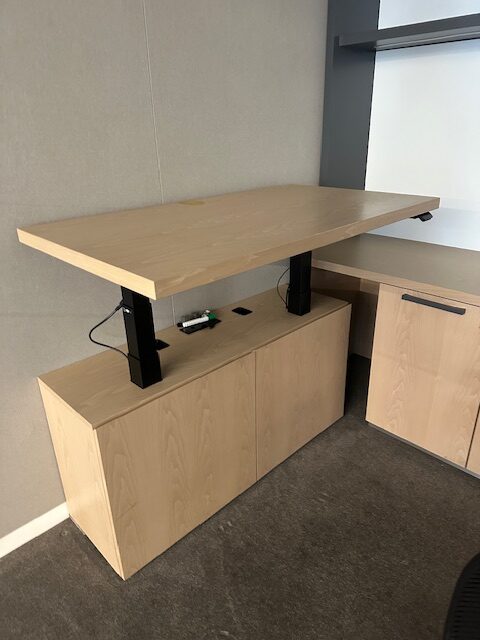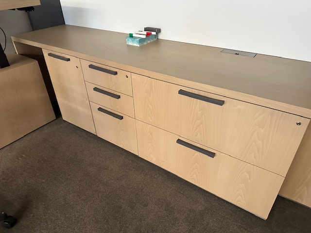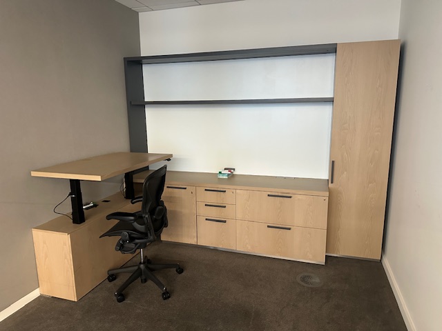 Upgrade your professional workspace with the Tuohy Private Office. This premium executive set features a light wood finish and includes an adjustable height worksurface for ergonomic flexibility. The comprehensive unit provides ample storage with integrated filing drawers, a spacious back credenza, and a tall wardrobe to keep your office organized and sophisticated.