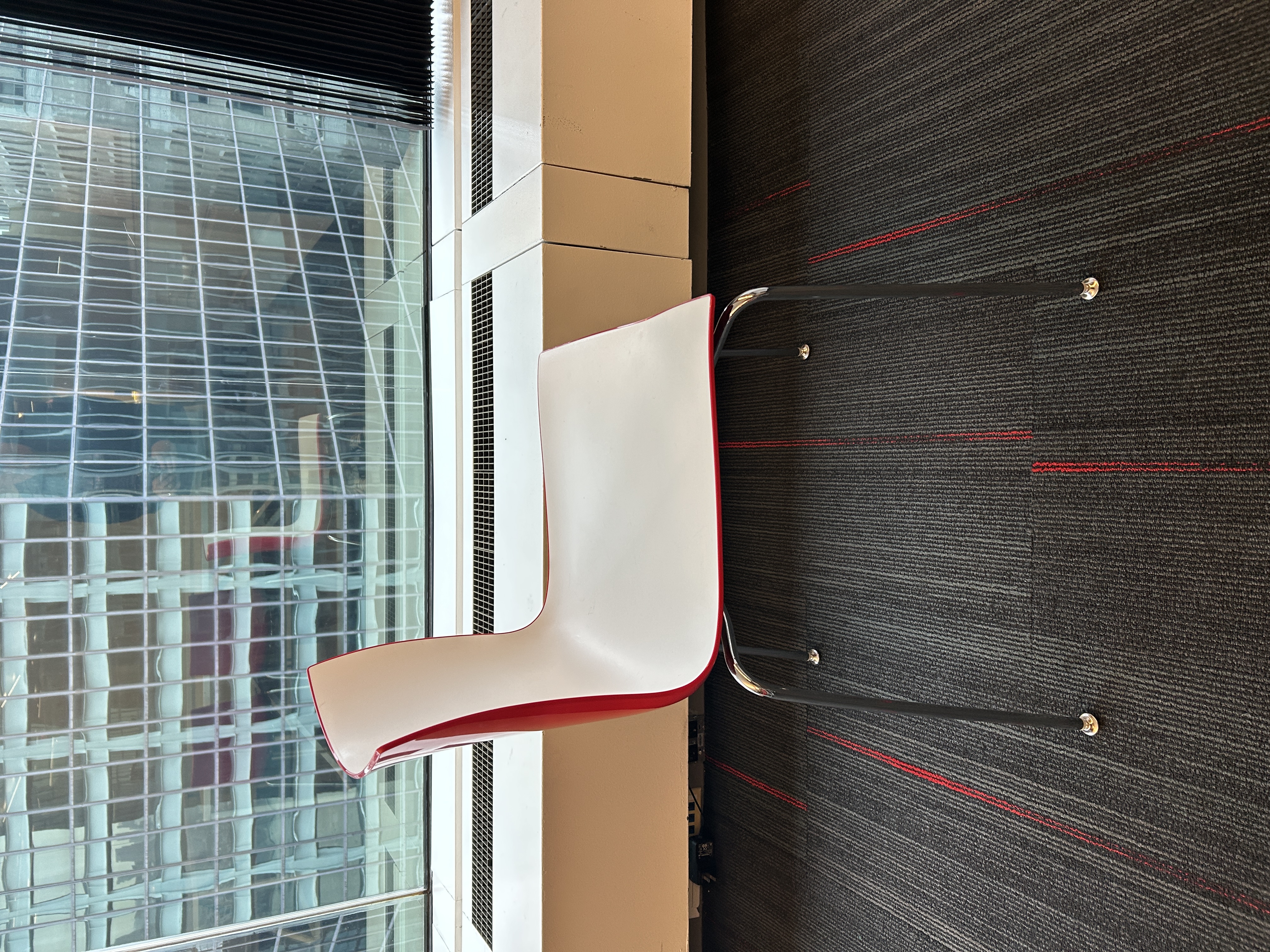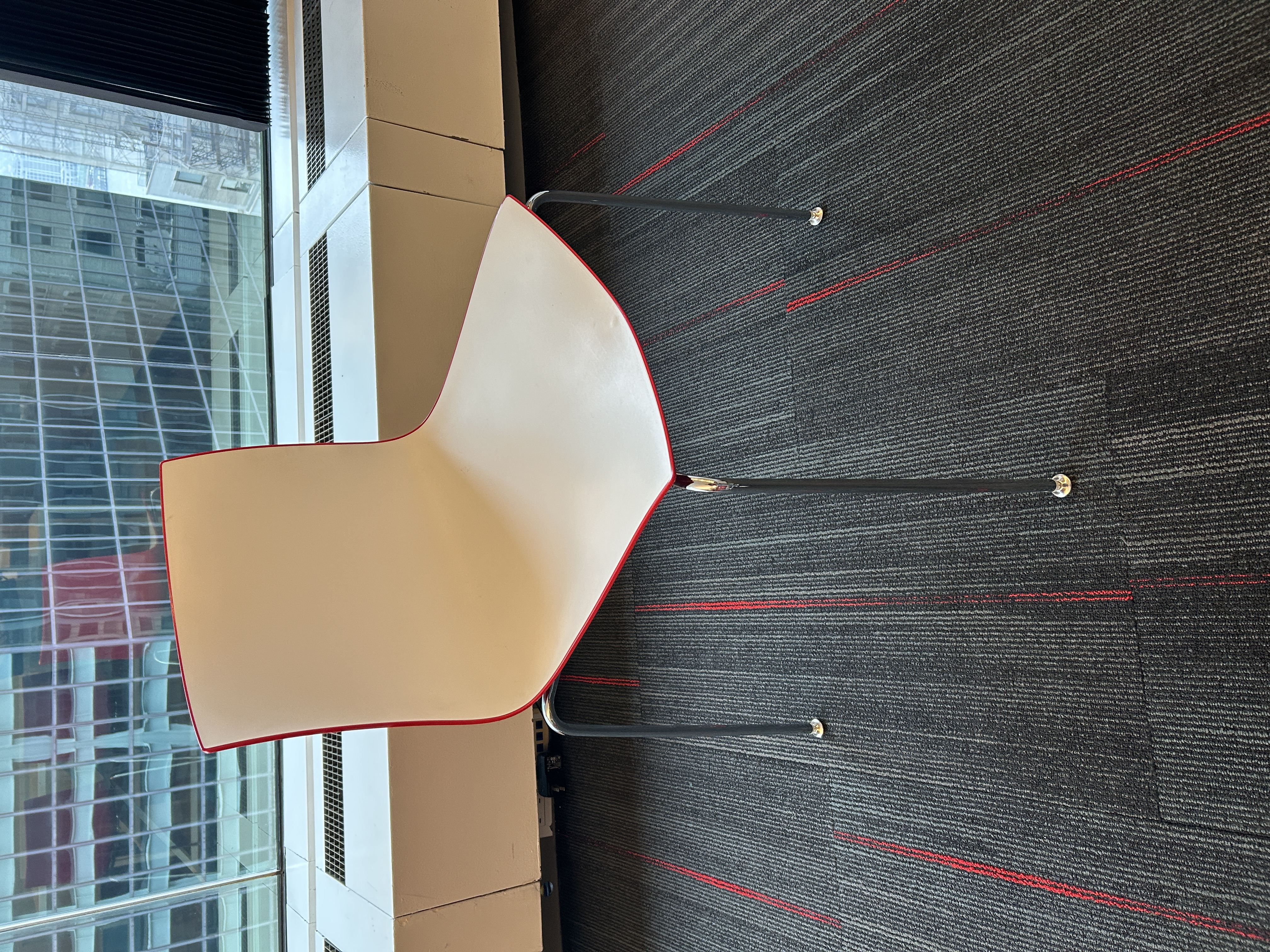 Add bold style to your space with this Arper stacking chair. Featuring a white seat with red pinstripe trim, red back, and sleek black post legs, it offers a lightweight yet durable design perfect for modern interiors. Stackable for easy storage and ideal for high-traffic areas.