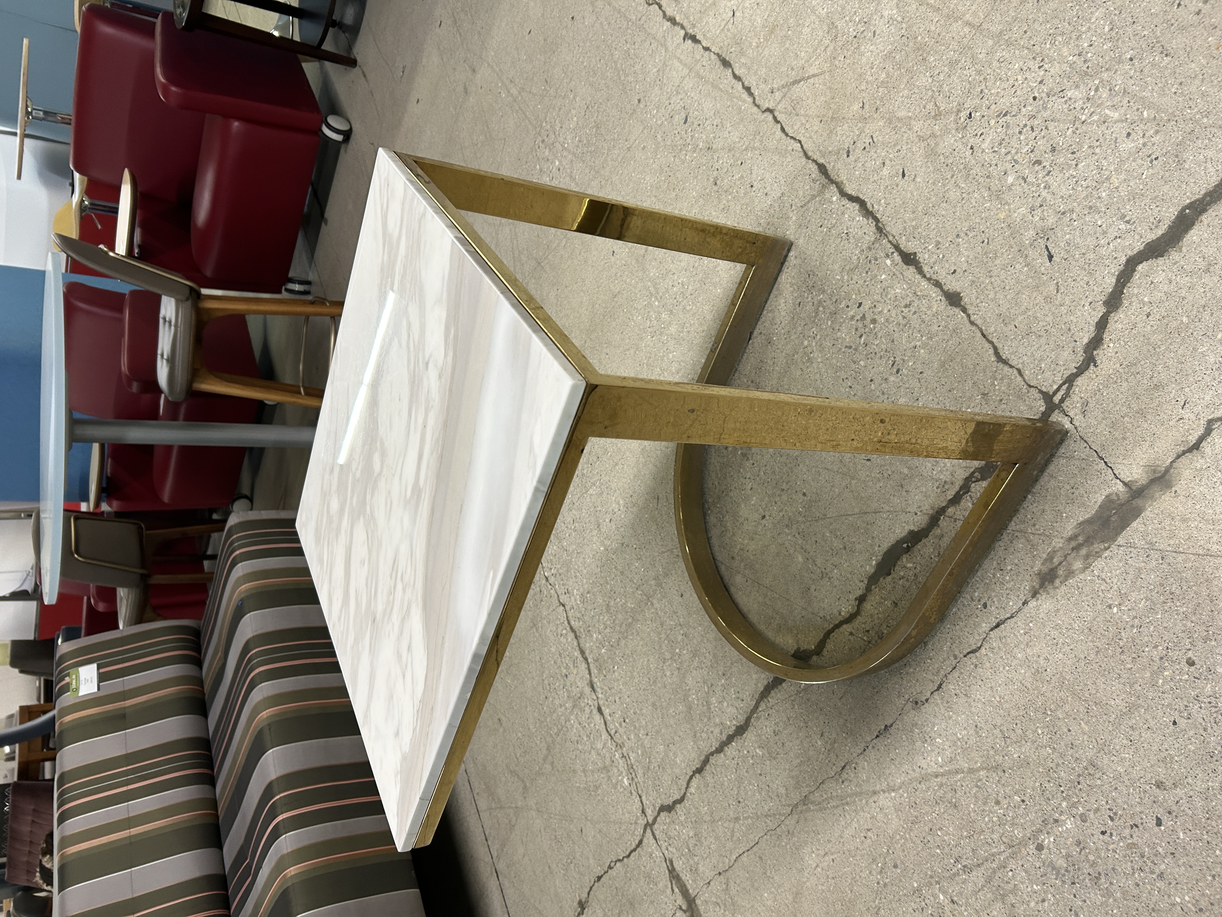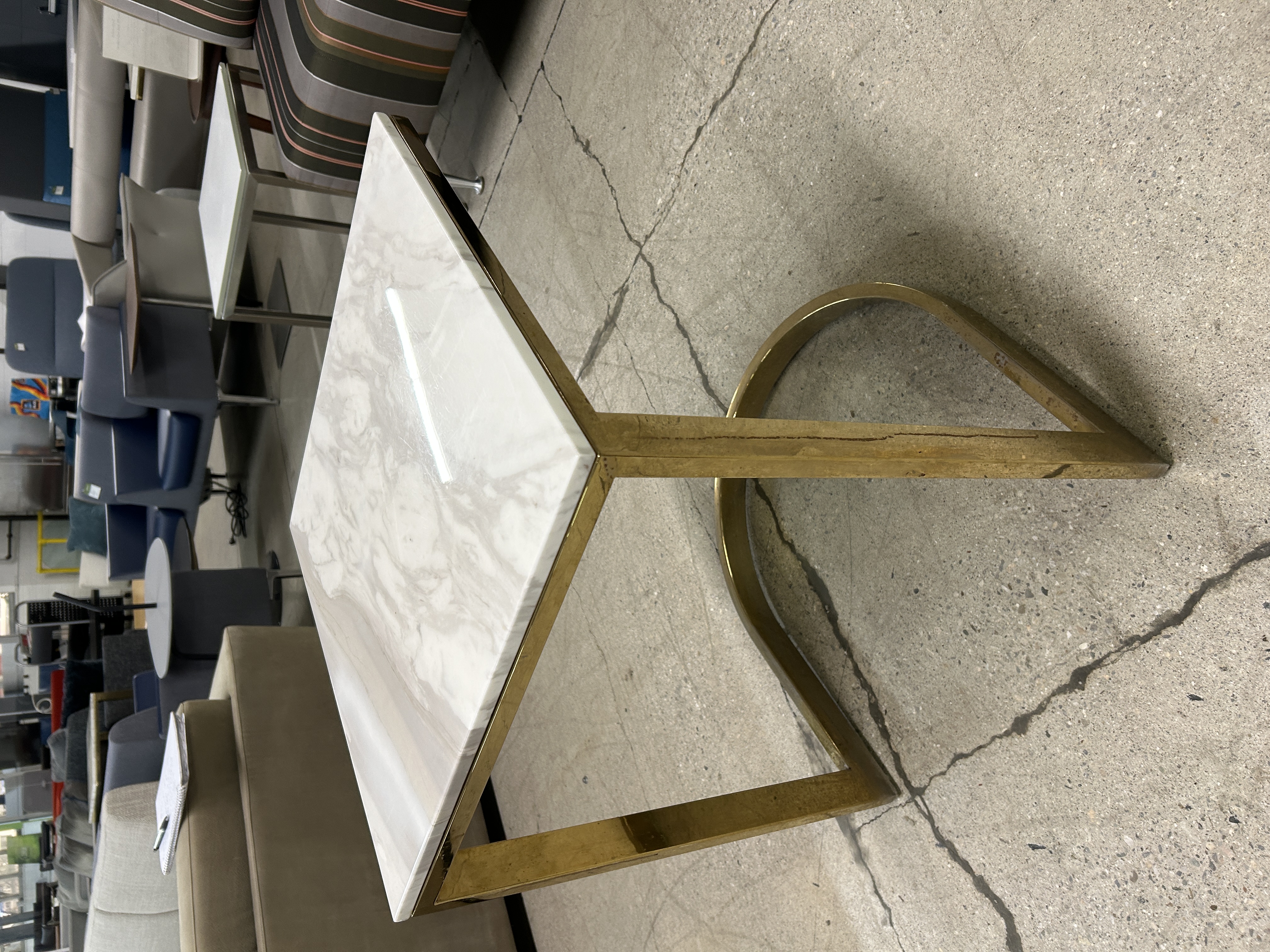Add elegance to any space with this White Marble End Table featuring a gold curved frame. Its luxurious materials and sculptural design make it a standout accent for modern lounges, offices, or reception areas.