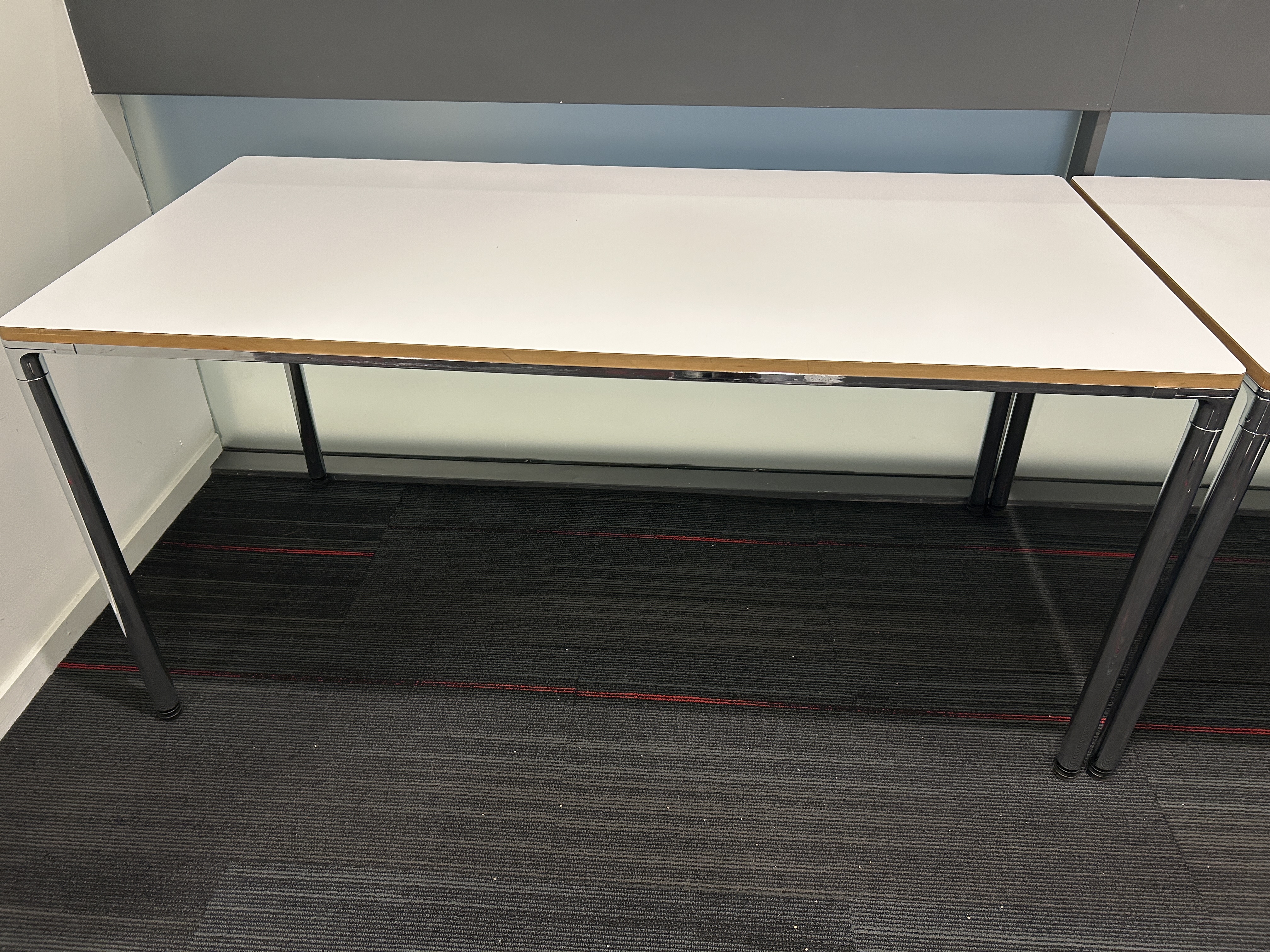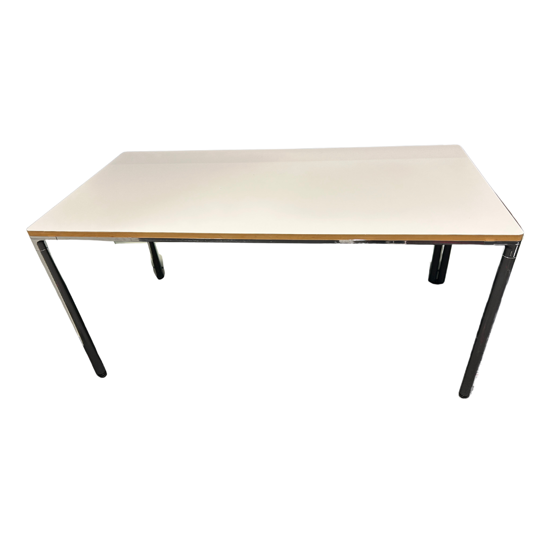 Optimize space with the White Wilkhahn Laminate Table featuring foldable feet. Its clean laminate surface and compact design make it ideal for flexible workspaces, training rooms, or collaborative areas. Easy to store and move, it offers durability with modern functionality.