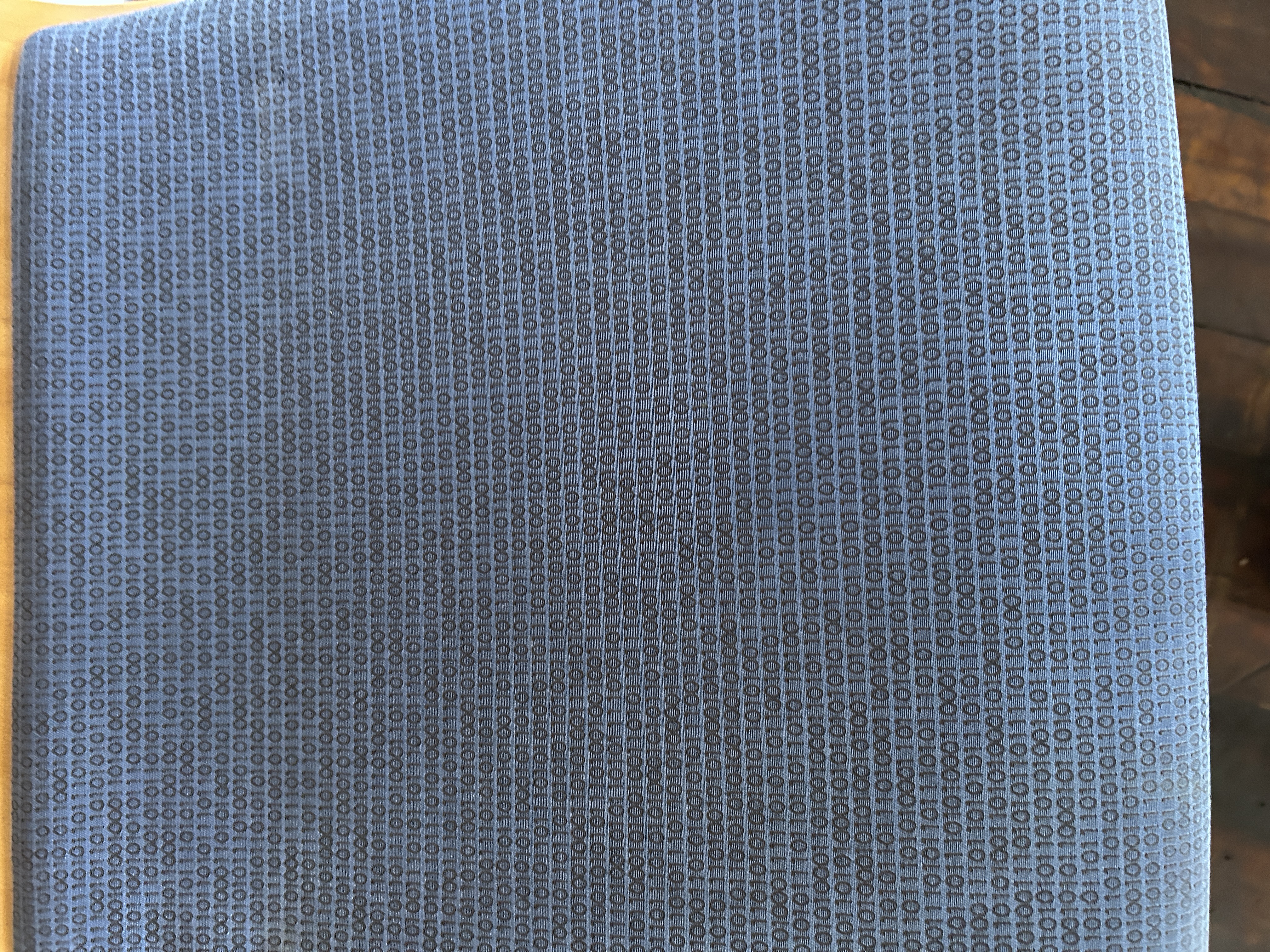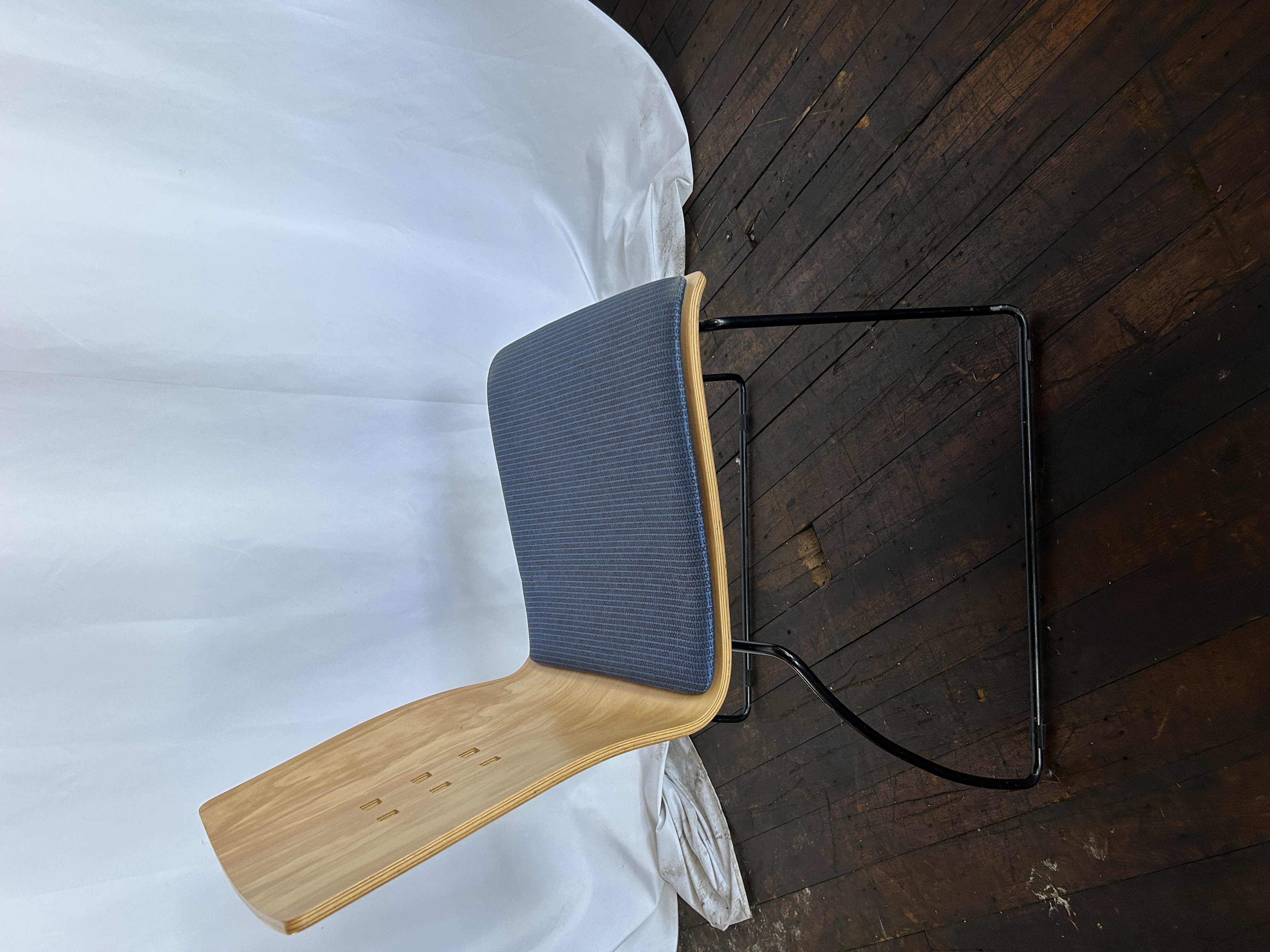 Elevate your space with our stackable Marquette Wooden Side Chairs, featuring a natural oak frame, a modern sled base, and a vibrant blue padded seat patterned with binary code zeros and ones. Designed for comfort, style, and durability—ideal for guest areas, break rooms, or reception settings.